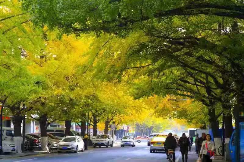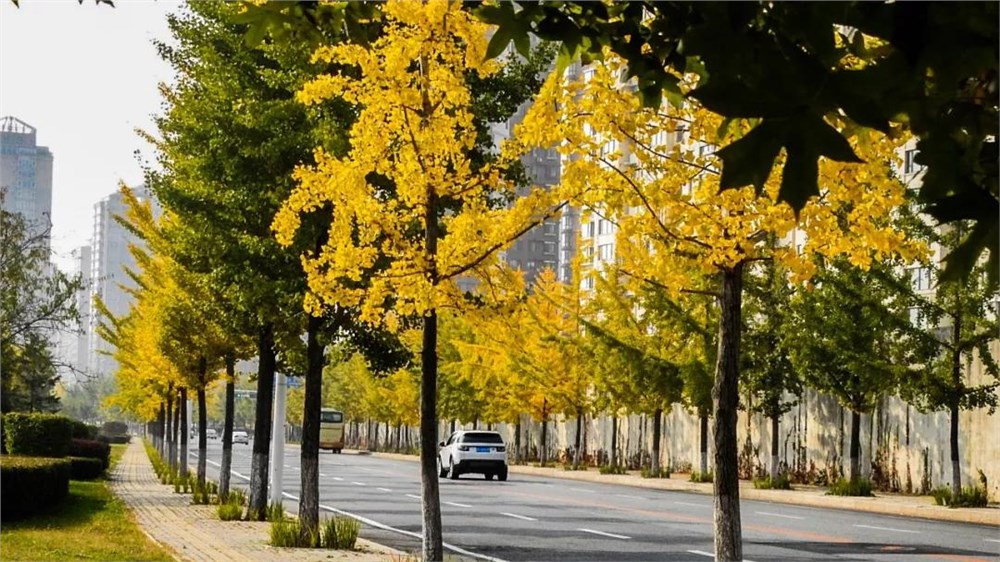 从目前情况看,这三条街路上的银杏树比较朝阳的一侧的树叶已经变黄,另一侧的树叶也已经泛出淡淡黄色,受温度和光照影响,大多数树木的树叶还是绿色。