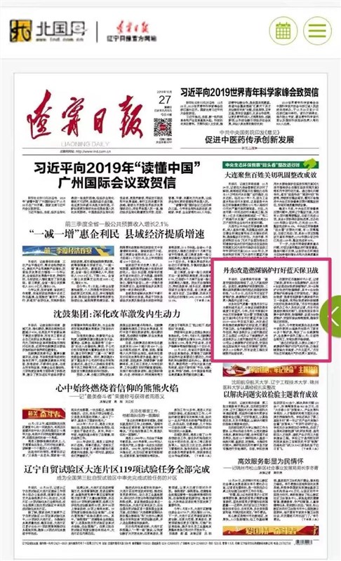 10月27日,《辽宁日报》头版以《丹东改造燃煤锅炉打好蓝天保卫战》为题,聚焦丹东燃煤锅炉达标改造工作……