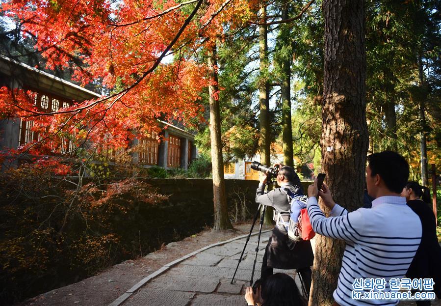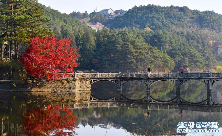 11月17日,游客在庐山如琴湖边游玩。 初冬时节,江西庐山风景区层林尽染,火红的枫叶吸引众多游客前来参观,令人流连忘返。 新华社记者 胡晨欢 摄