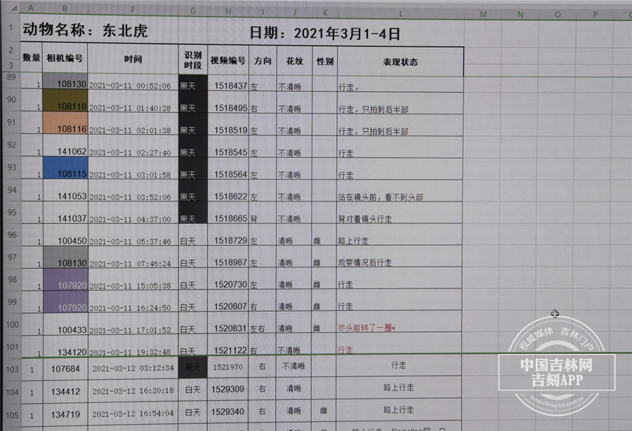 中国吉林网了解到,目前,该分局配备了几千台能够实现实时监测和传输的远红外相机,而这些相机的“终端”,则是监控中心的监控平台。在这里,实时记录着每一次拍摄到的虎、豹以及其它野生动物的影像,最多的时候,一天能有20余条记录。
