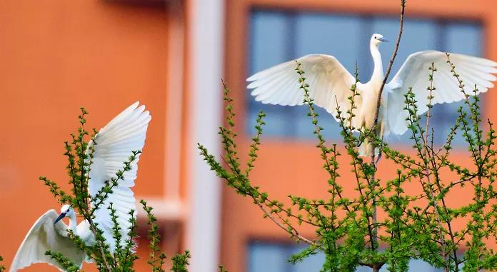 这些白鹭在林间修筑巢穴,清晨到附近的江中觅食,傍晚回巢,带回泥鳅、面条鱼等食物。