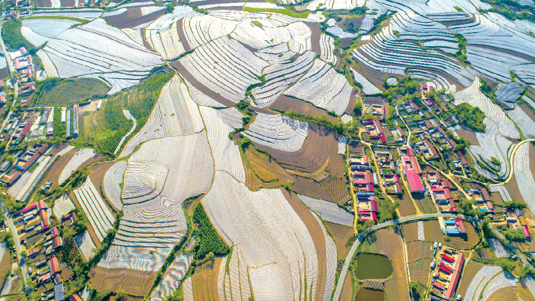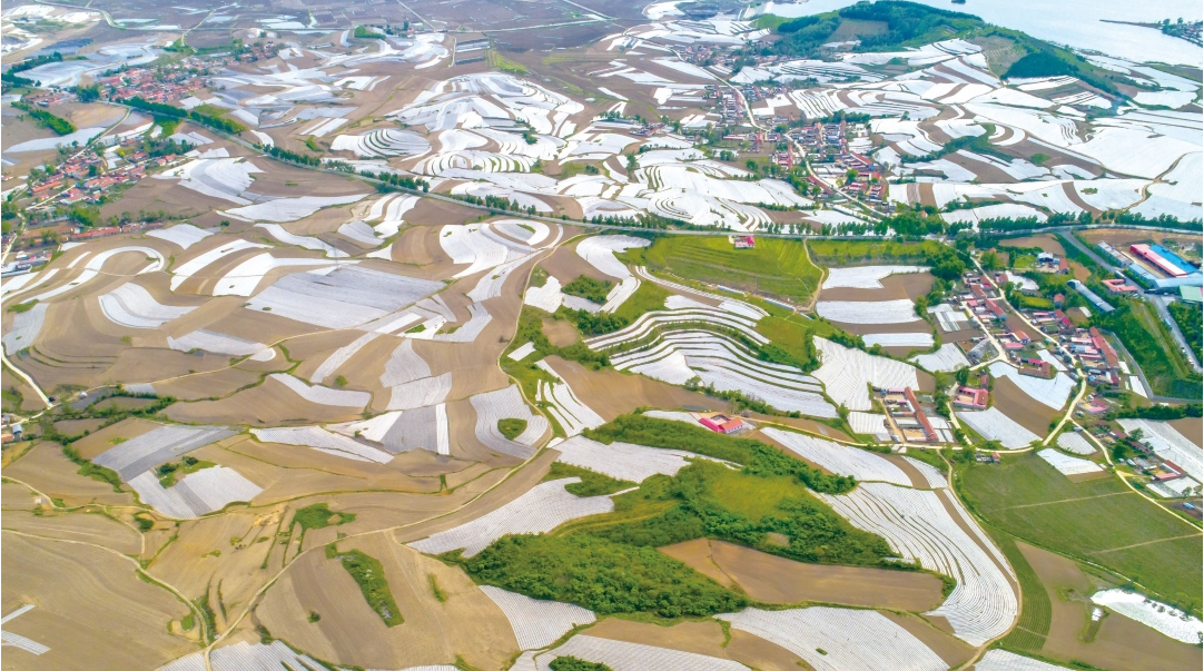 新农镇多丘陵,农田高低错落,花生地膜与蜿蜒曲折的田埂线条交织出的流动光影,吸引了众多省内外摄影爱好者前来采风创作。