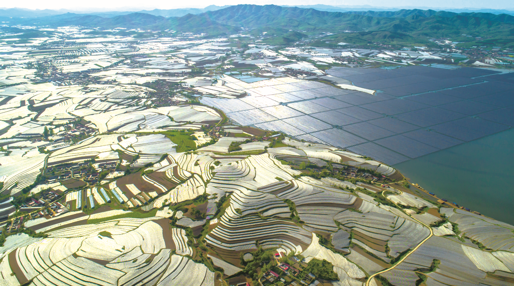 廉家坝水库光伏电站与多姿多彩的农田组成的田园画卷,在光影映衬下不断变幻色彩。