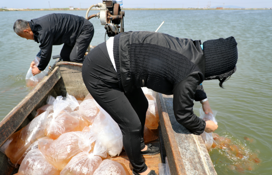 5月25日9时,北井子镇虾圈,已经有养植户开始在虾圈投放海蜇苗。虾圈负责人周公庆告诉记者,他已经养殖海蜇30多年。每年五月份前后,就开始在虾圈里投放海蜇苗。海蜇苗的投放十分讲究,水温需要在15摄氏度左右,最高温度不能超过30摄氏度,幼苗在投放进虾圈中的时,一定要选择风小的地方,方便海蜇苗下潜至水底。海蜇苗的投放密度不能过大,每亩的投放量预计在500-1000个苗种最为适宜。