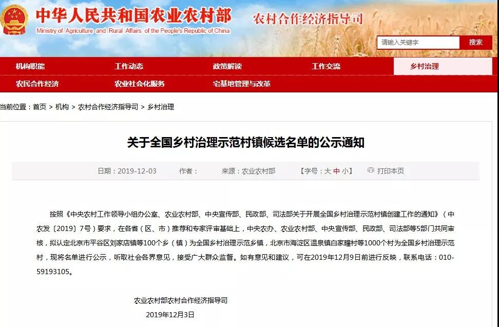 近日,农业农村部公示全国乡村治理示范村镇候选名单,拟认定100个乡(镇)为全国乡村治理示范乡镇,1000个村为全国乡村治理示范村。