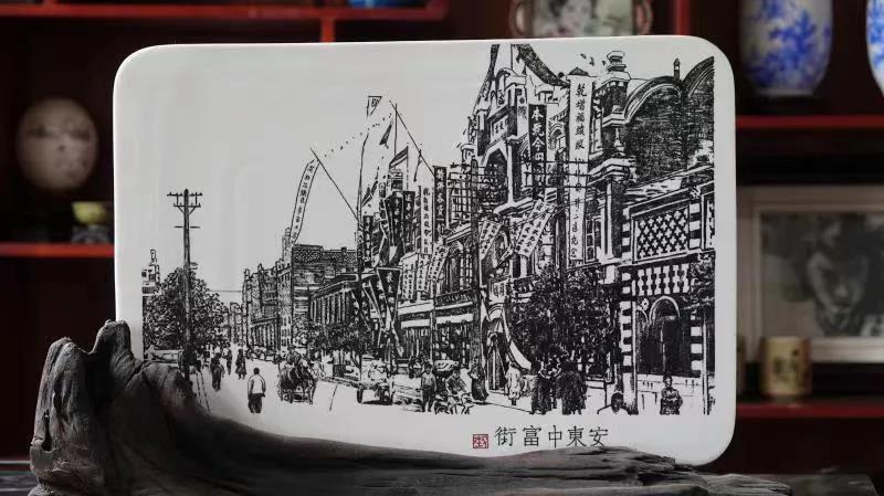 载誉归来,景晴又投入到对技艺的钻研中。随着技艺不断提高, 2017年,她成为了市级非物质文化遗产项目“宽甸线刻石画技艺”传承人。同年,又被评为辽宁省工艺美术大师。她身上的担子更重了,开始思考如何去宣传自己的家乡。“从丹东的老照片上,我找到了灵感。”在景晴的工作室中,挂着几件以老安东时期的照片为题材,等比例制作的陶瓷雕刻作品,这些作品是由她和另外两位师傅共同完成,命名为《忆安东》。在2019年中国漆器艺术精品展暨中国扬州工艺美术精品展上,该作品获得了“漆花杯”工艺美术精品大赛金奖。也凭借该作品,许多人认识了丹东。