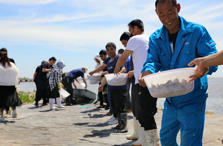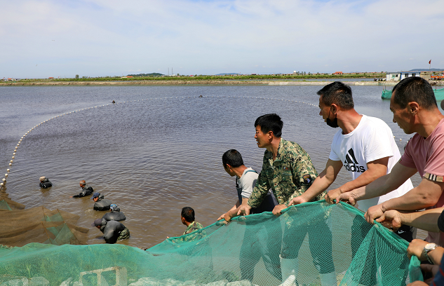 6月17日,在东港市长山镇海边虾圈附近,丹东港临港集团协同东港市祥顺渔业有限责任公司将350万尾河豚鱼苗增殖放流。