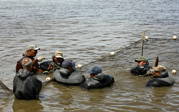 与其他增殖放流不同的是,本次增殖放流是在虾圈附近进行的,由于红鳍东方鲀的放流体型较大,已经不适合袋装近海放流,经过协商后决定,在虾圈附近的海岸放流,养殖红鳍东方鲀的虾圈可以经过短时间的捕捞上网,通过不锈钢制成的斜坡倾倒入海。“现在虾圈的海水盐度是22.6,海中的海水盐度是22.4,水温也相近,这也是为什么选择在虾圈附近放流的主要原因之一,这样做既可以避免运输成本,还可以保证河豚鱼苗的成活率,是十分高效简洁的放流方式。”辽宁省海洋水产科学研究院副研究员柴雨告诉记者。