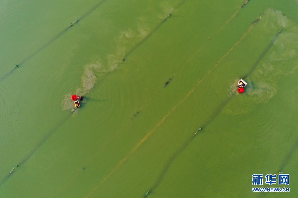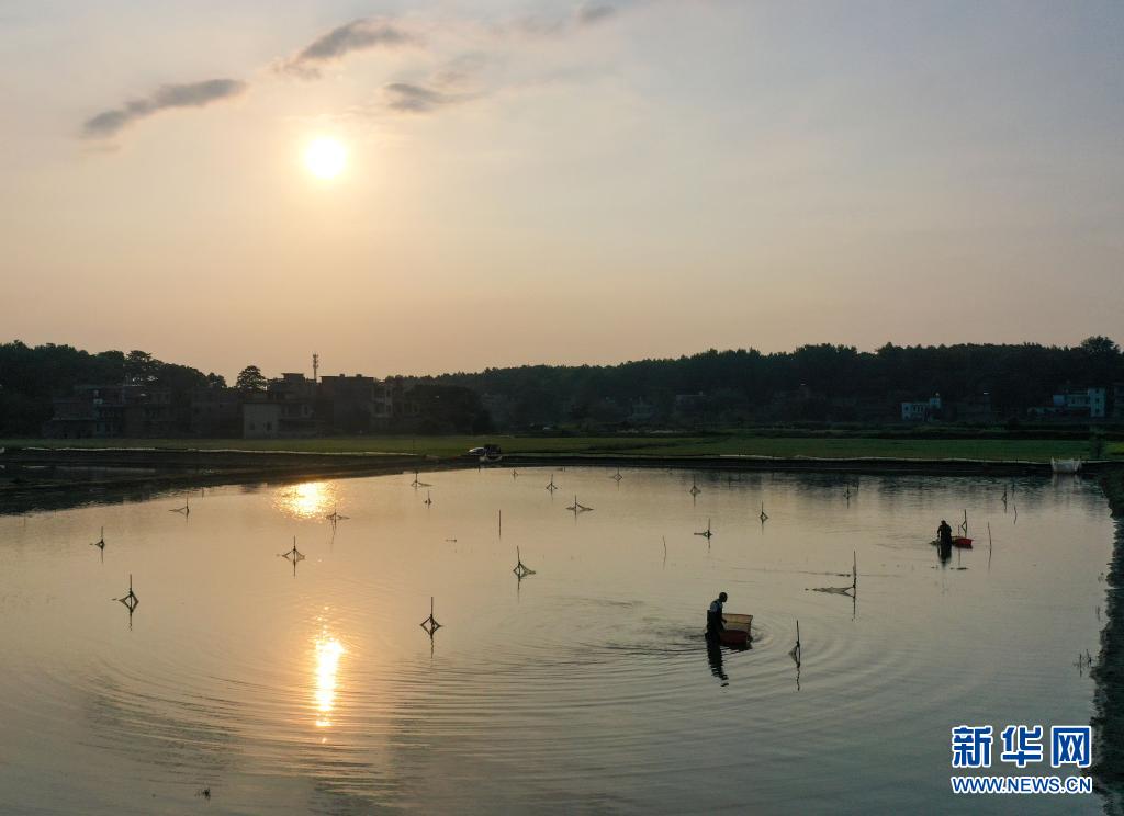 7月5日,在湖南省永州市道县蚣坝镇洲背村,村民在收获小龙虾(无人机照片)。