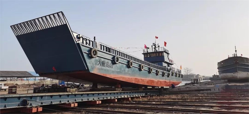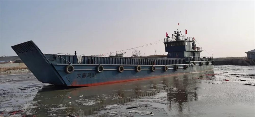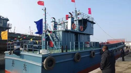 12月11日上午,在丹东市新康船业有限公司造船厂船坞道上,随着阵阵鞭炮声响起,一艘41多米长的平底船下水,由该公司承建的“大鹿岛6号”交通运输船正式交付使用。