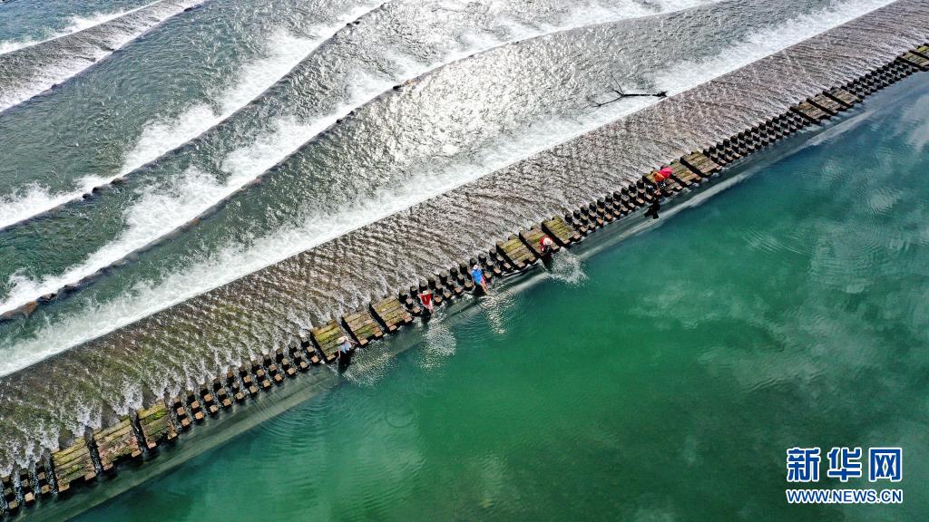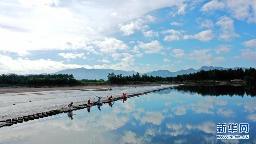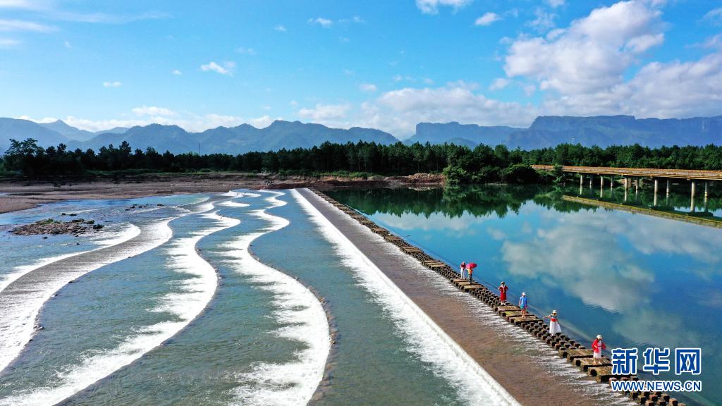 当日,浙江省台州市仙居县永安溪流域水面如镜,蓝天、白云倒影水中,构成一幅美丽的画卷。新华社发(王华斌 摄)