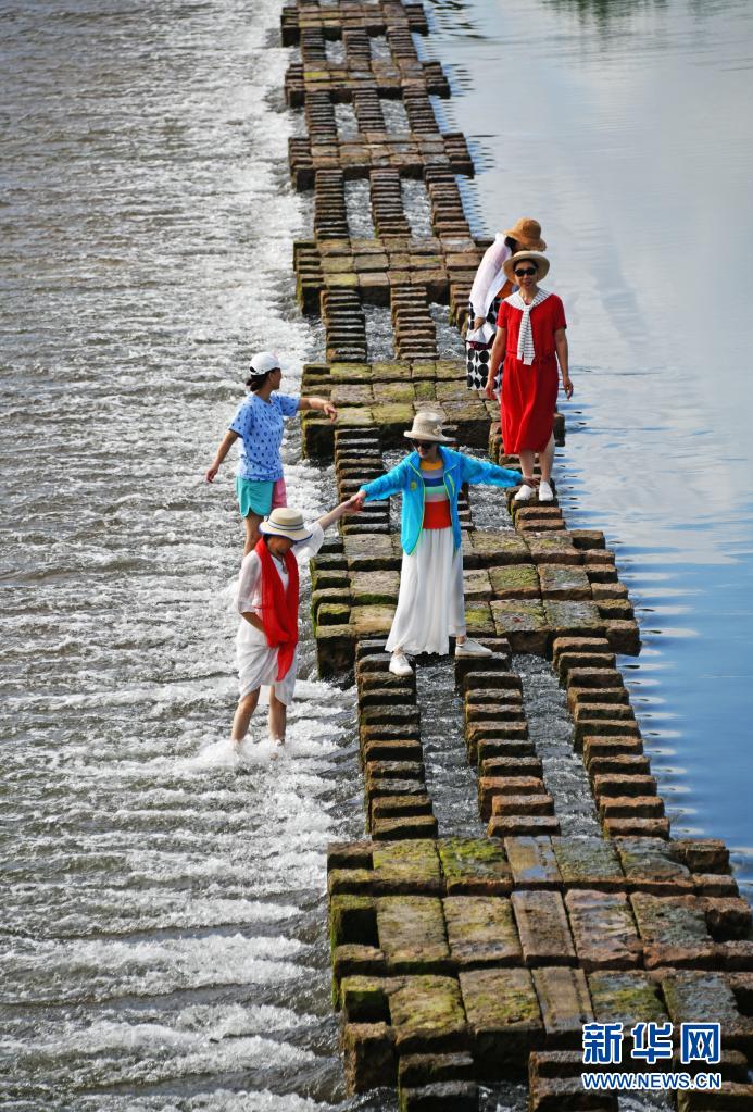 7月6日,市民在浙江省台州市仙居县永安溪白塔镇段游玩(无人机照片)。