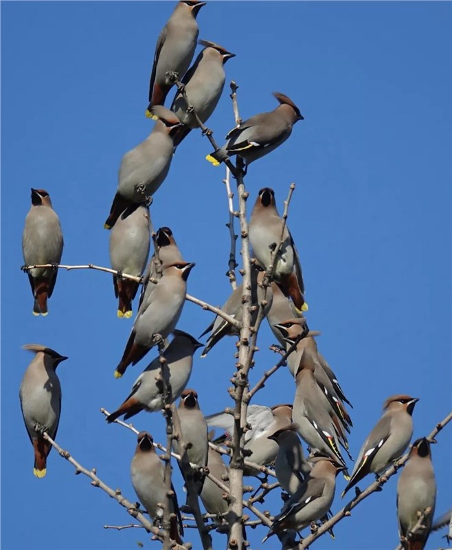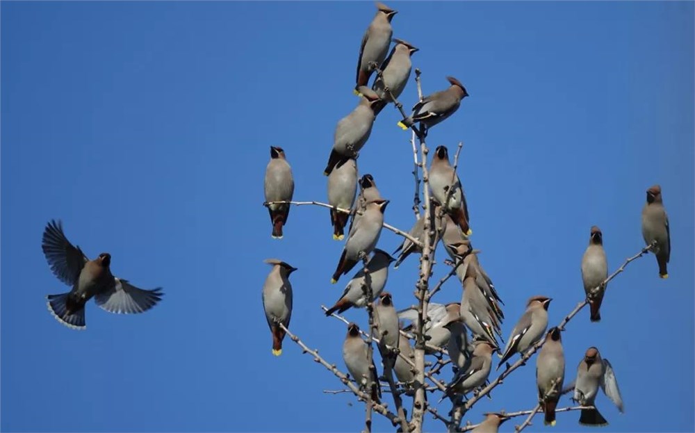 到了12月12日上午,由数百只大太平鸟和小太平鸟组成的鸟群,飞到鸭绿江公园的松林中,有秩序地在公园吃着公园的松树果,喝着鸭绿江水。迅速成为松林间的“主人”,喜鹊和红尾鸫只好远远地躲开了。