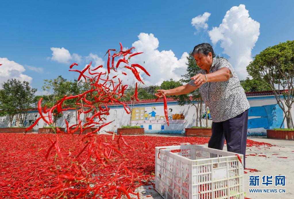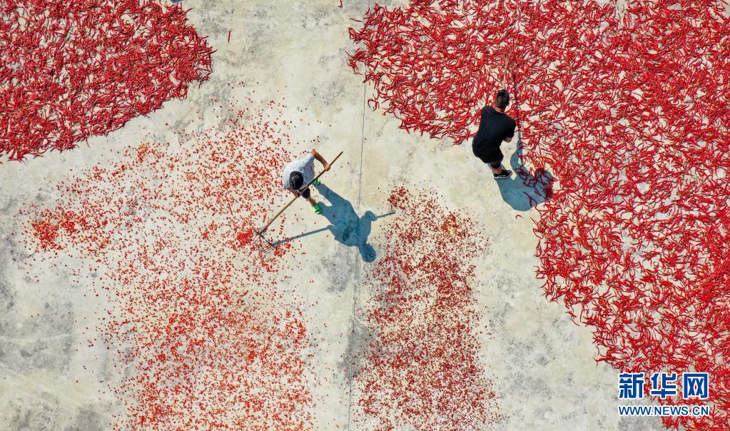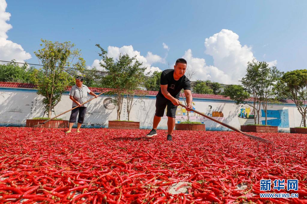 近日,贵州省铜仁市玉屏侗族自治县田坪镇的辣椒迎来丰收,当地农户抓紧时间采摘、晾晒辣椒,房前屋后呈现一片红红火火的丰收景象。