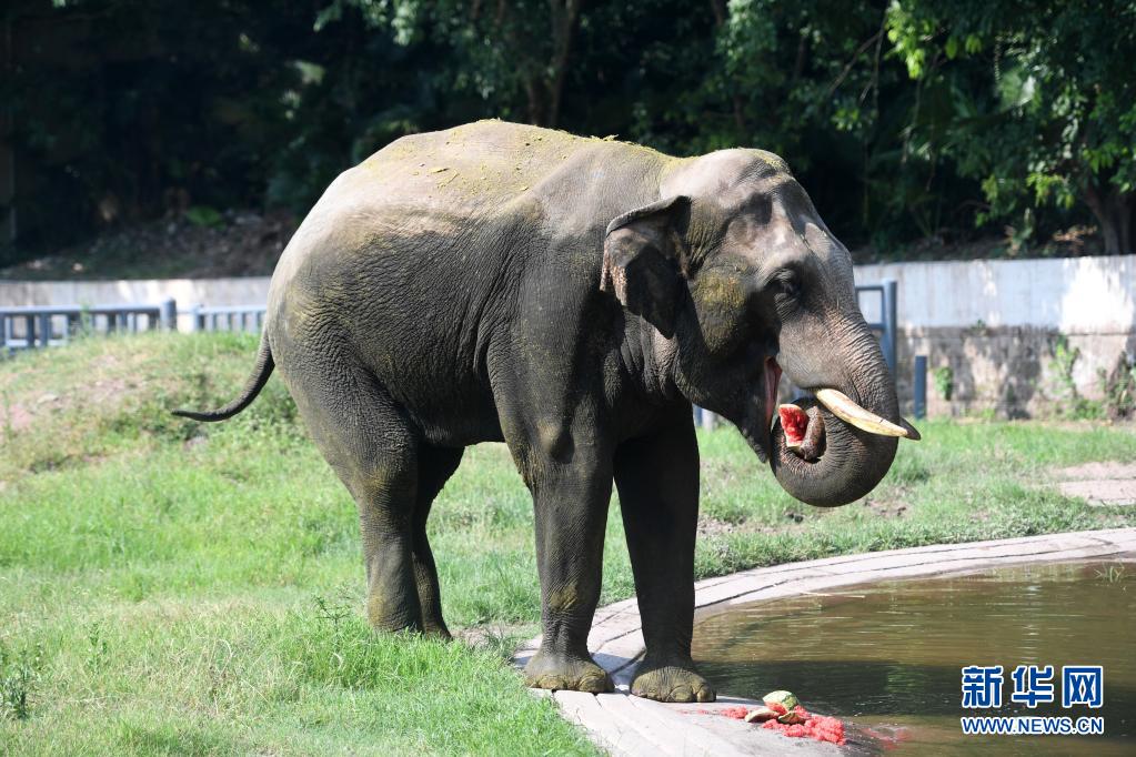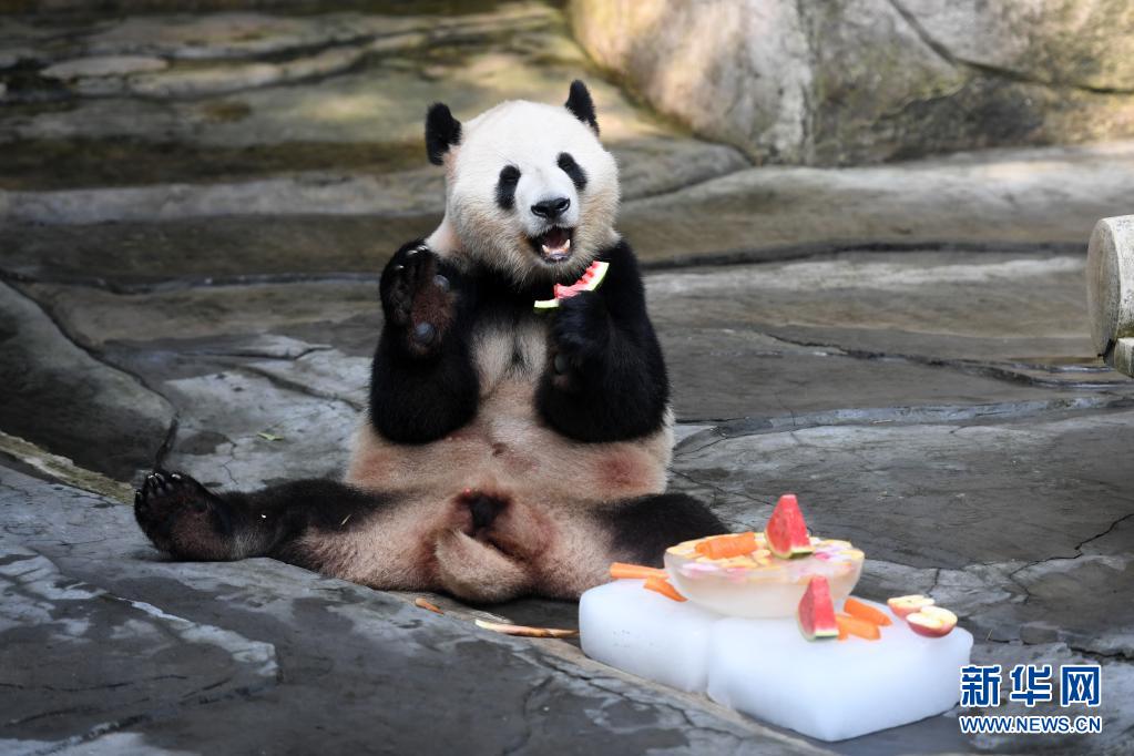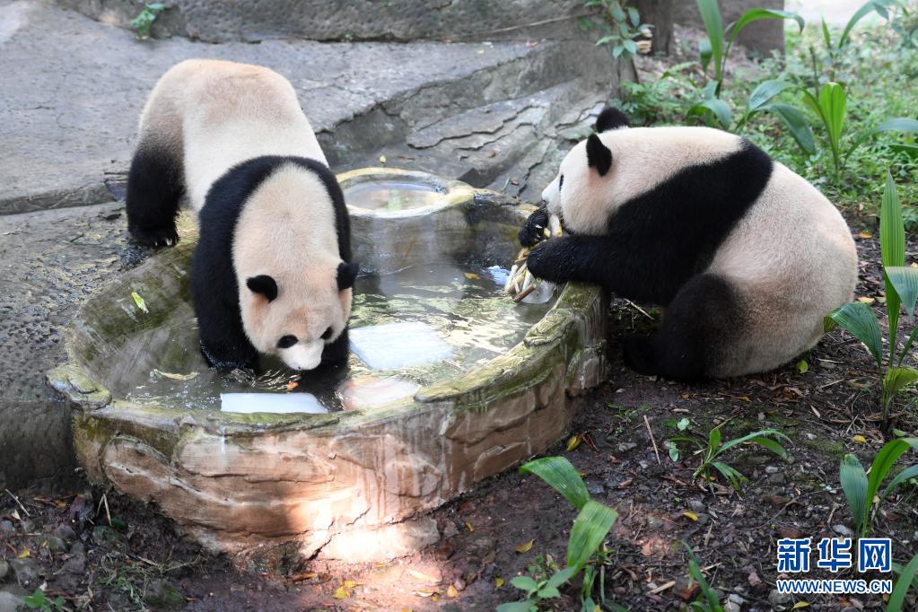 7月29日,在重庆动物园,两只大熊猫玩水“消暑”。近来重庆连日高温,重庆动物园为了让动物们清凉度夏,采用多种“妙招”为动物们防暑降温。新华社记者 唐奕 摄