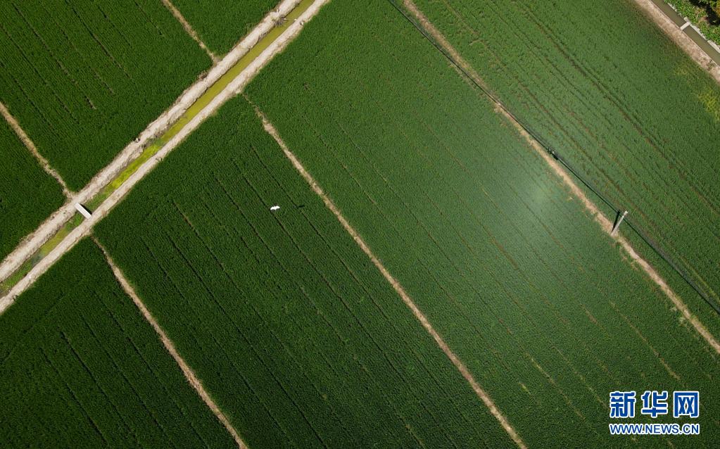 8月7日,在上海松江泖港镇朱定村,一只白鹭从稻田上空飞过(无人机照片)。