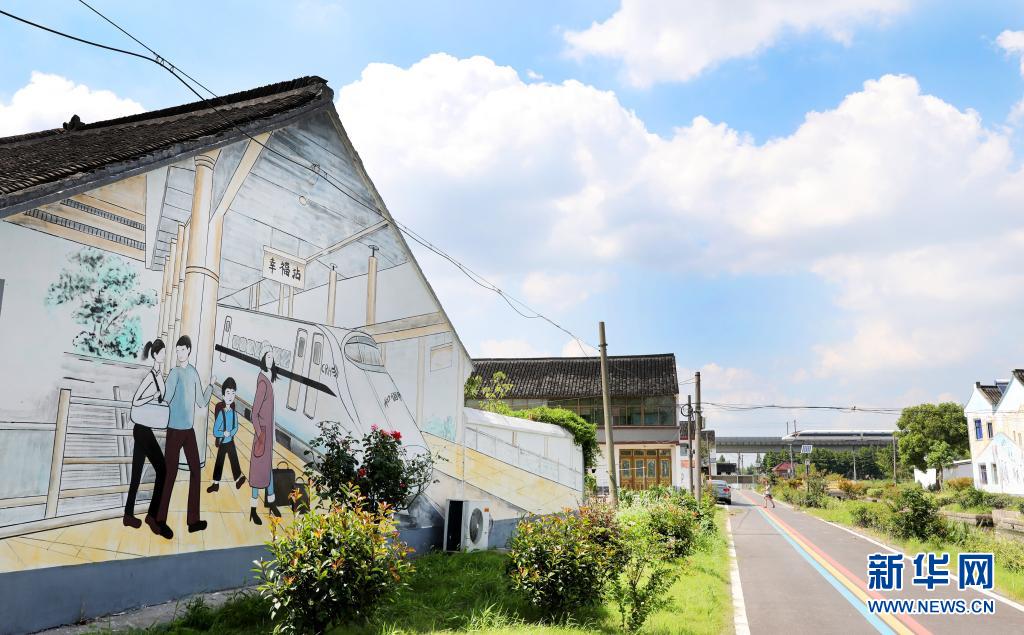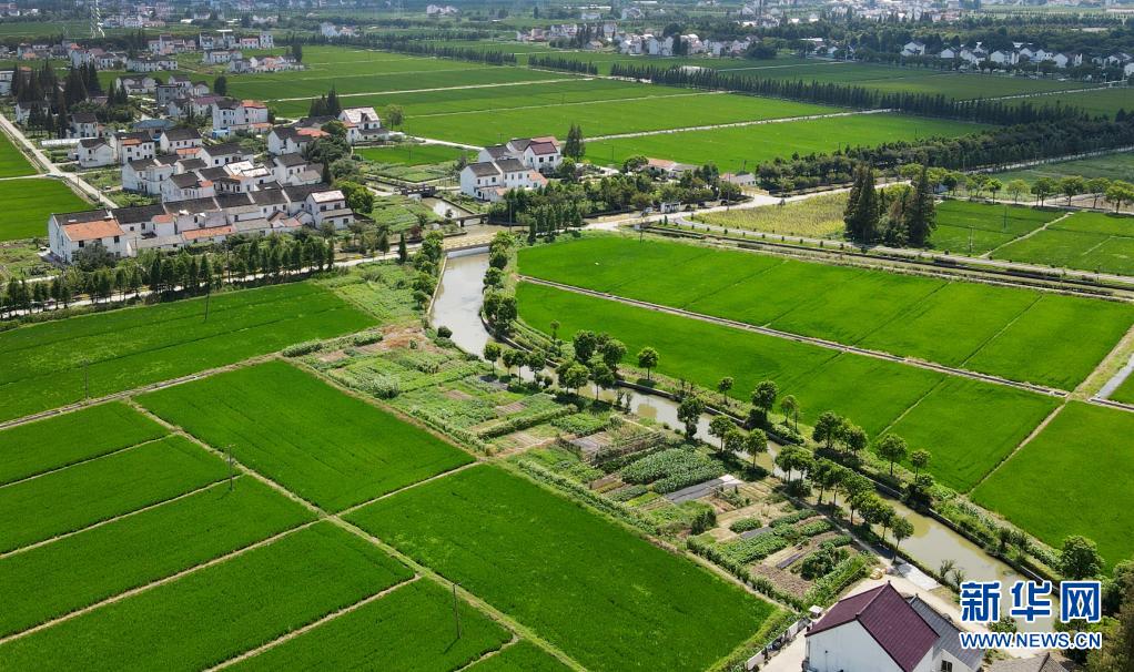 当日是立秋节气。在上海松江泖港镇朱定村,彩绘的民居点缀在稻田之间,蓝天白云,景色宜人。