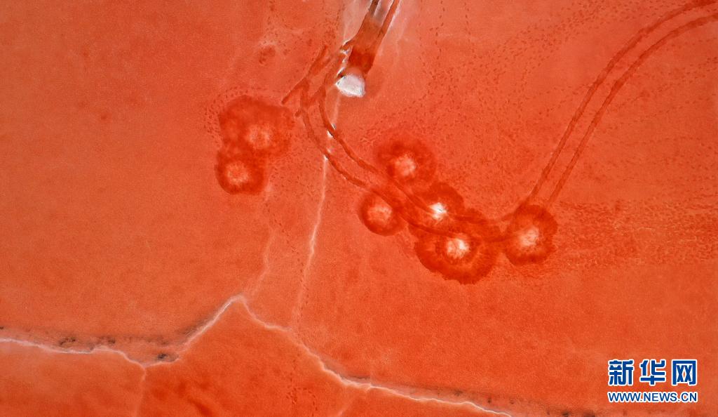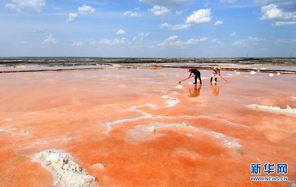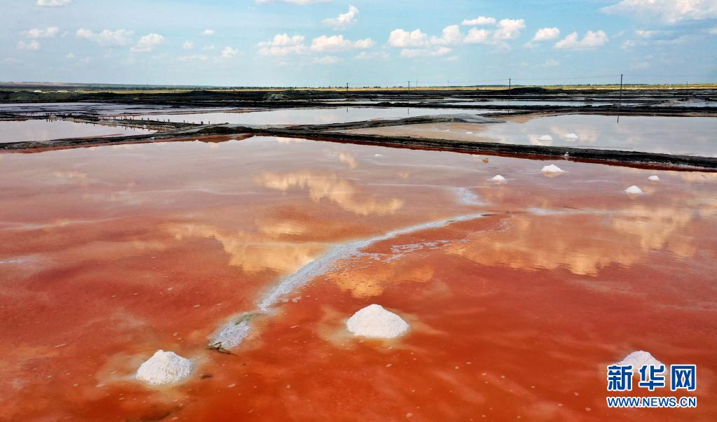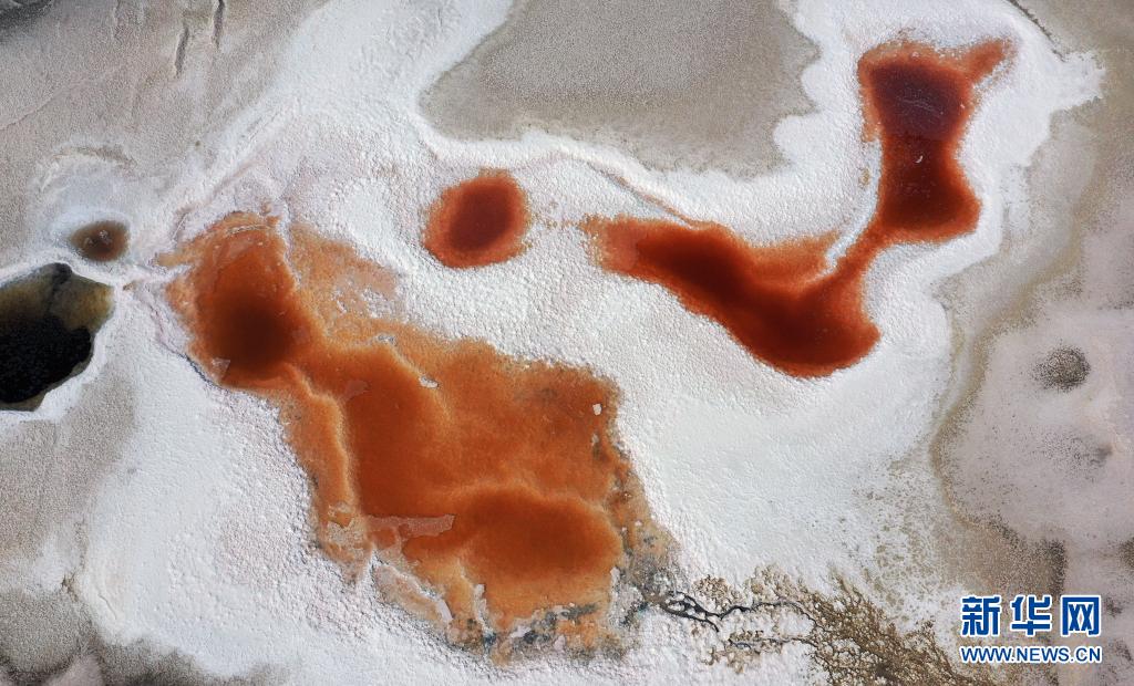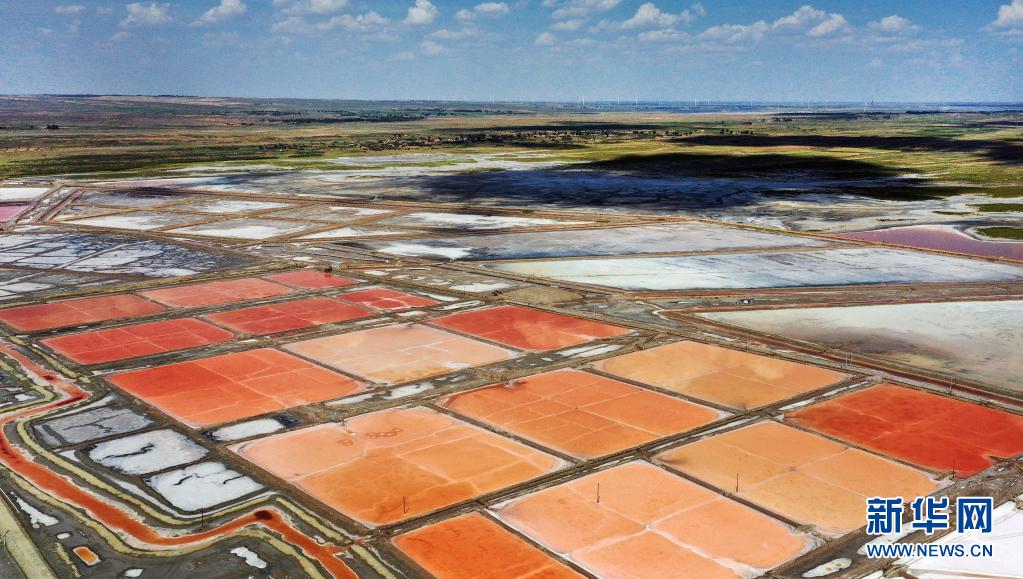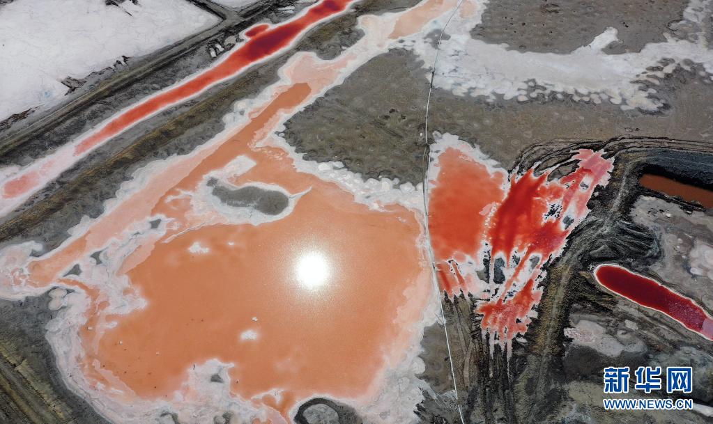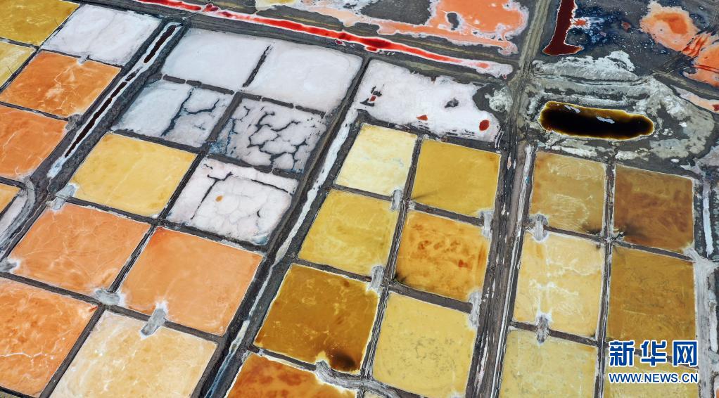 陕西省榆林市定边县是陕西省的湖盐产区,盐湖群主要分布在一条西南至东北走向的弧线低洼地带。每年的夏秋时节,湖中不同的矿物成分和藻类,让盐田在高温和光线的共同作用下呈现出五彩斑斓的颜色,仿佛铺陈在大地上的调色板。