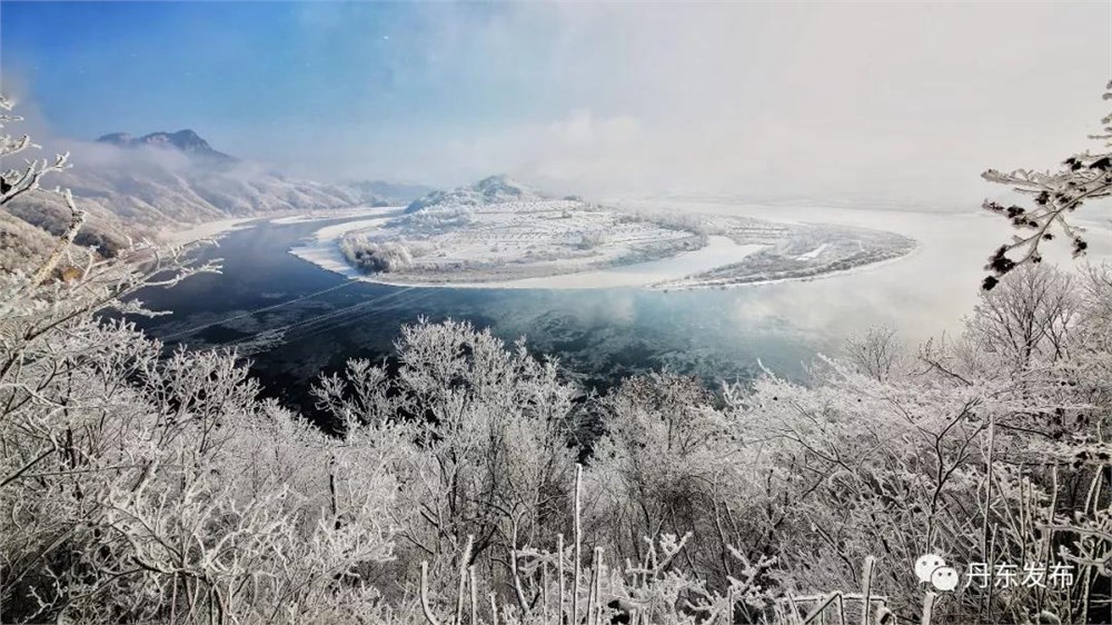 山中森林、江岸草木挂满了洁白晶莹的雾凇,玉树琼花,清秀淡雅,宛若人间仙境。