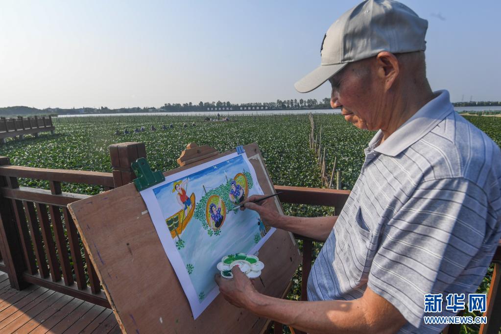 8月19日,在浙江省嘉兴市秀洲区油车港镇西千亩荡,菱农们坐着水乡特有的菱桶采摘成熟的菱角。