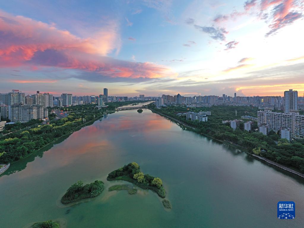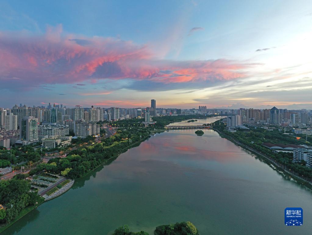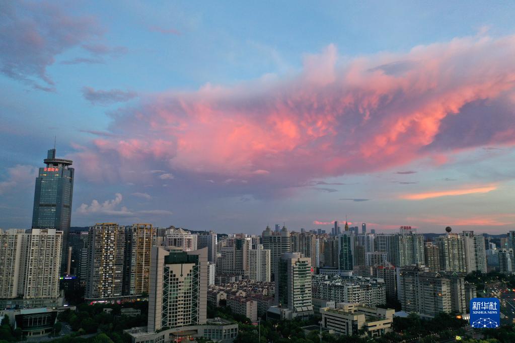 当日,广西南宁市天空出现绚丽晚霞。美丽晚霞掩映下的城市格外美丽。