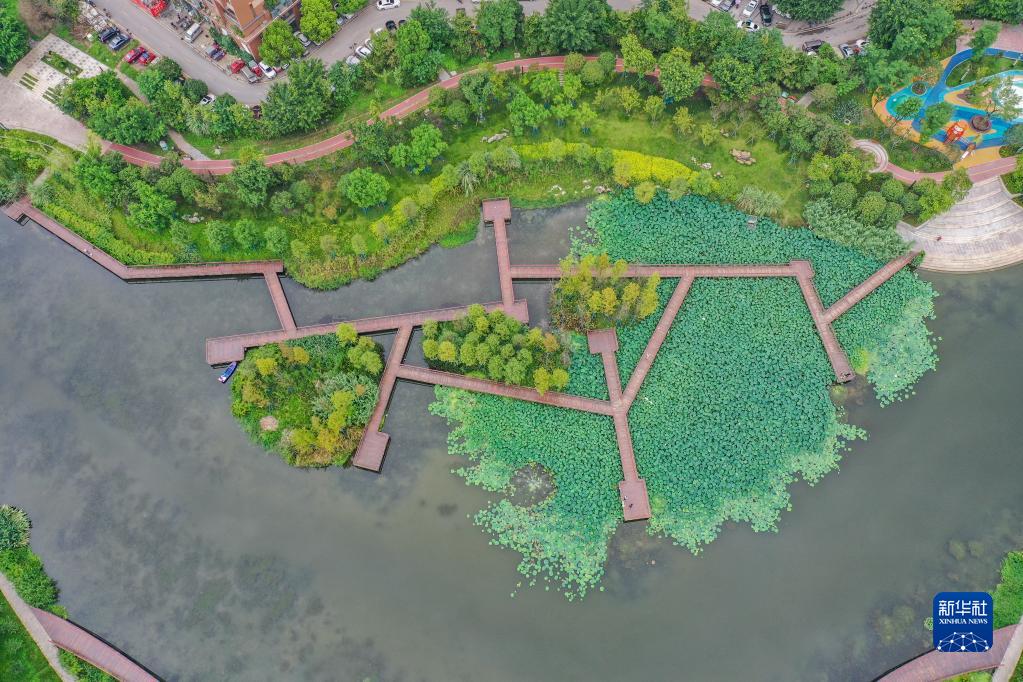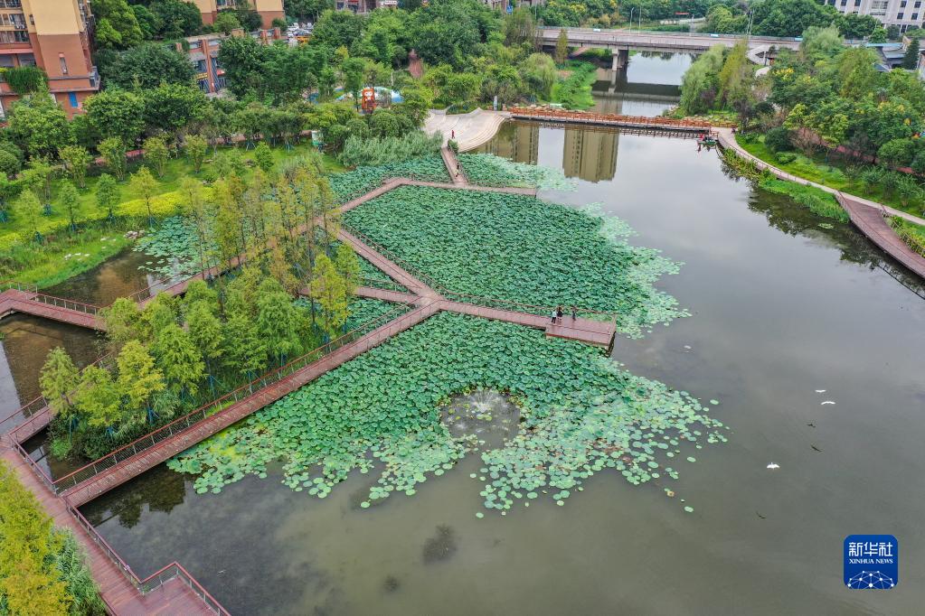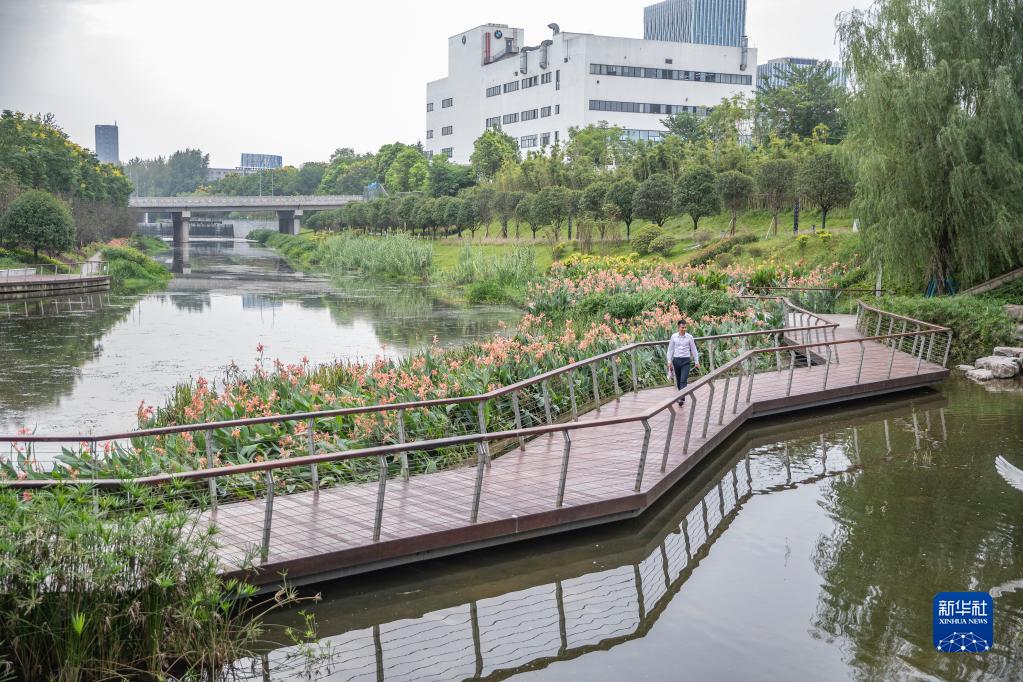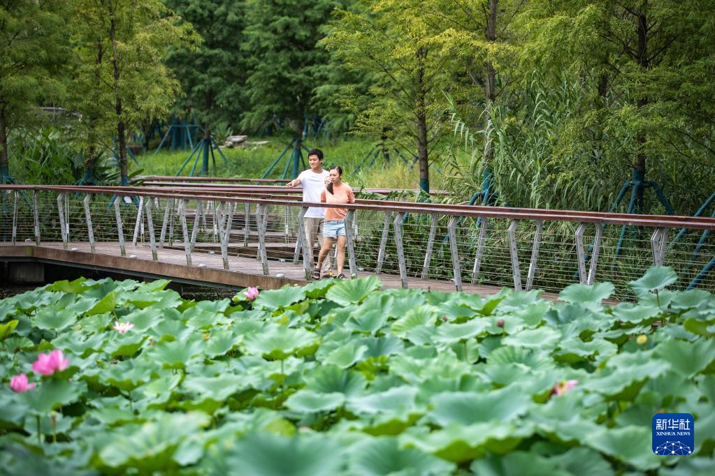 9月7日,在重庆市南岸区苦竹溪流域上游示范段,居民在亲水栈道散步。