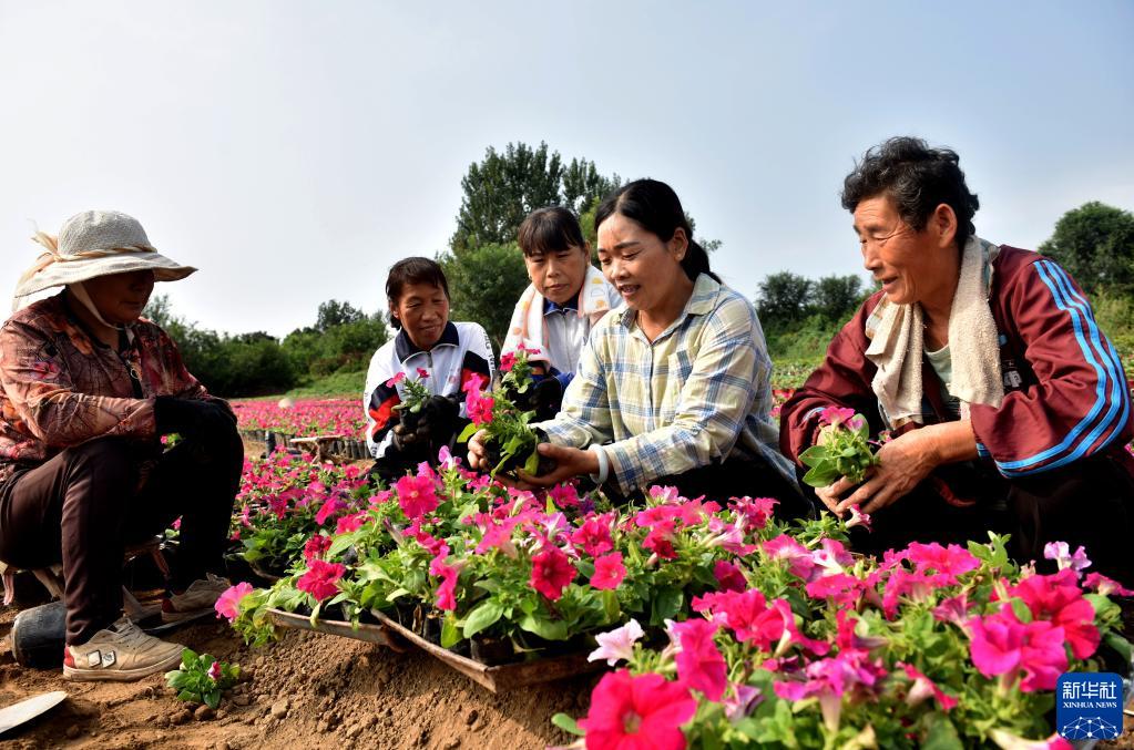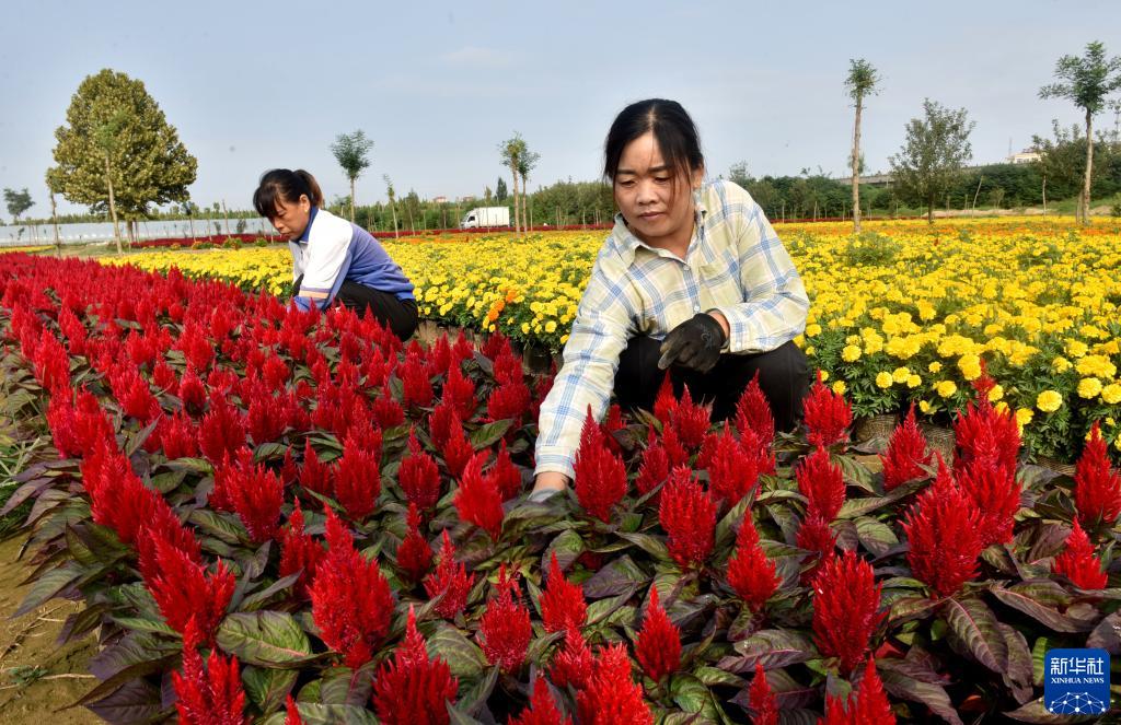 9月22日,王素霞(右)在花卉基地劳作。