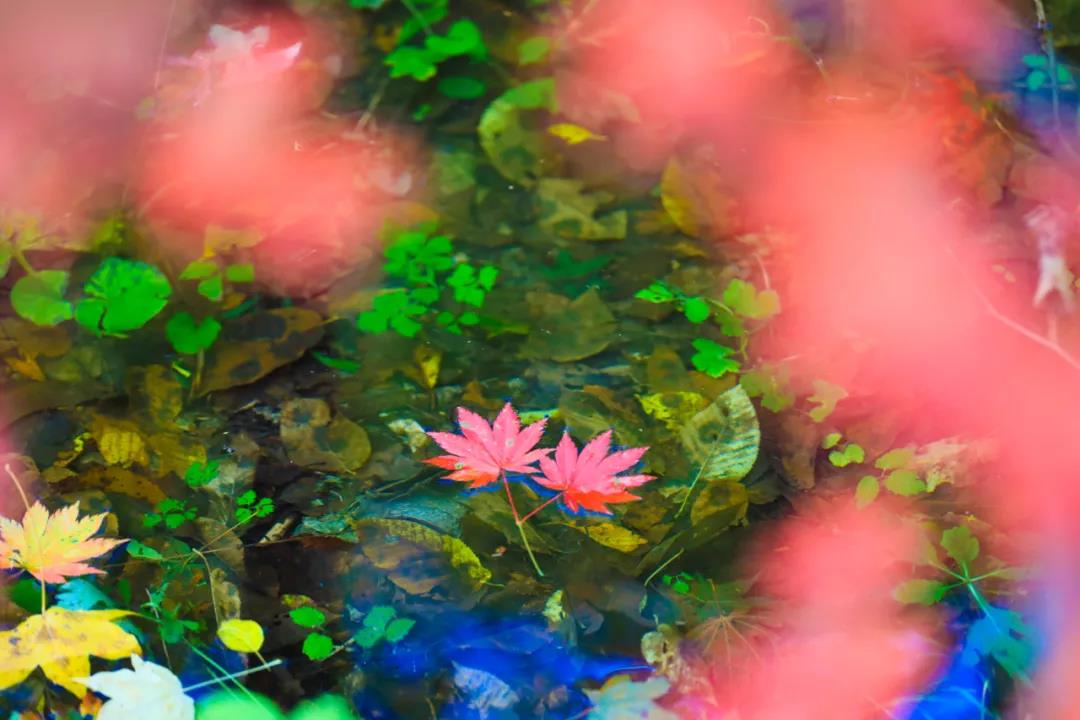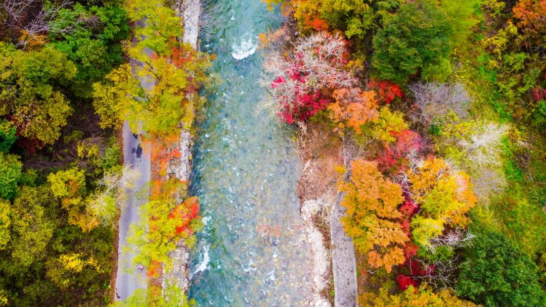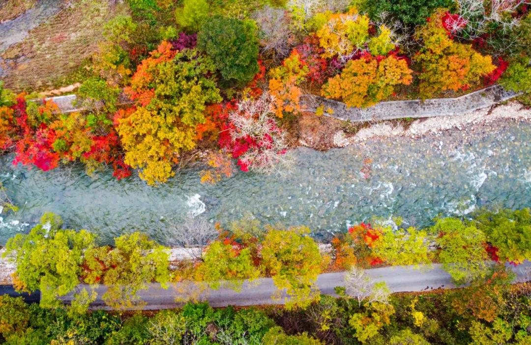记者沿着道路缓缓前行,路边清澈见底的溪流,岸边红黄绿相间的色彩斑斓,万山彩叶, 仿佛走进一幅美妙的秋景画中。