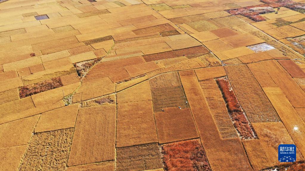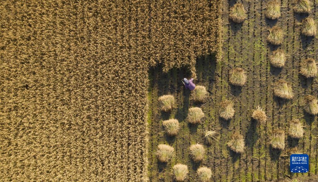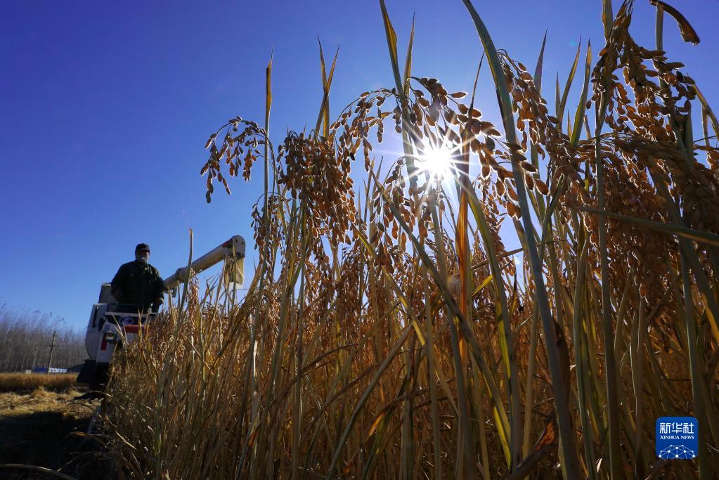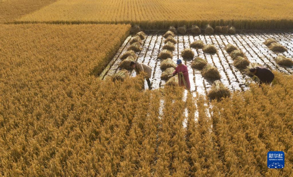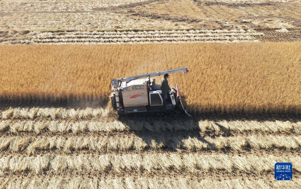 深秋时节,河北省滦州市种植的水稻迎来收获季,稻田间遍地金黄,当地农民抢抓晴好天气收获水稻,确保颗粒归仓。