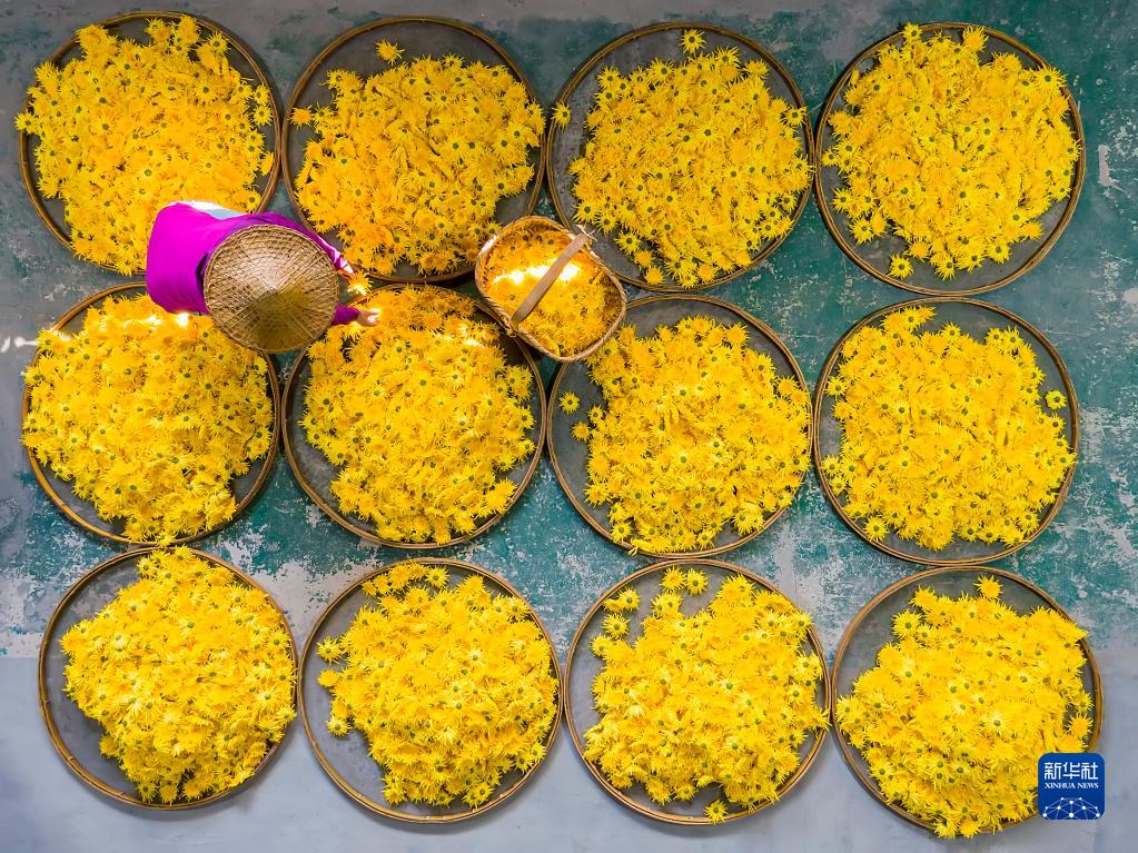 近日,位于浙西山区的浙江省杭州市淳安县大墅镇桃林村种植的金丝皇菊进入采摘期,农民趁晴好天气忙着采摘、分拣、烘烤,制做金丝皇菊花茶。