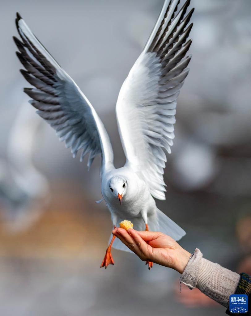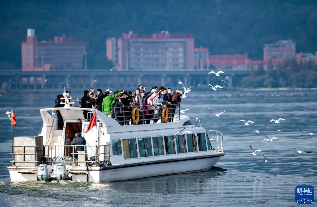 11月21日,游客在海埂大坝上投喂红嘴鸥。