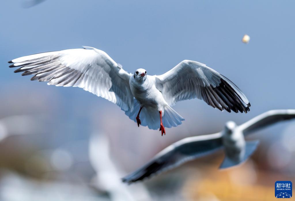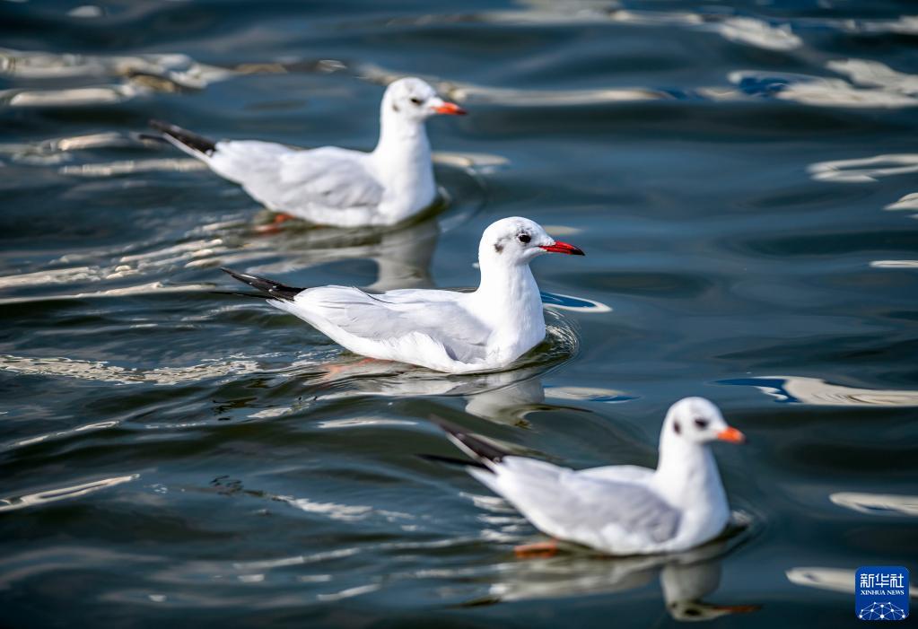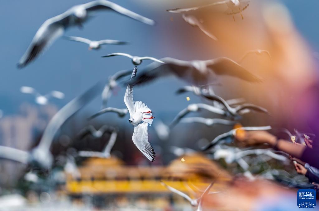 当日,春城昆明天气晴好。在滇池海埂大坝,成群的红嘴鸥时而盘旋、时而嬉戏。