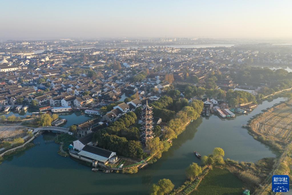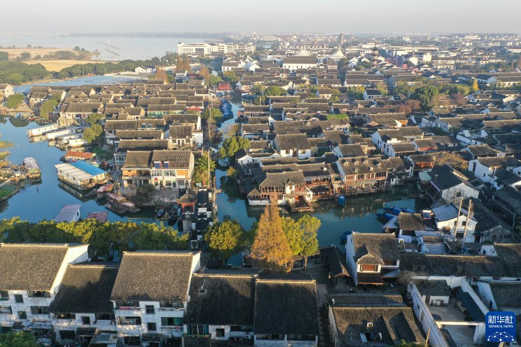 沐浴在晨曦中的周庄景色(11月24日摄,无人机照片)。