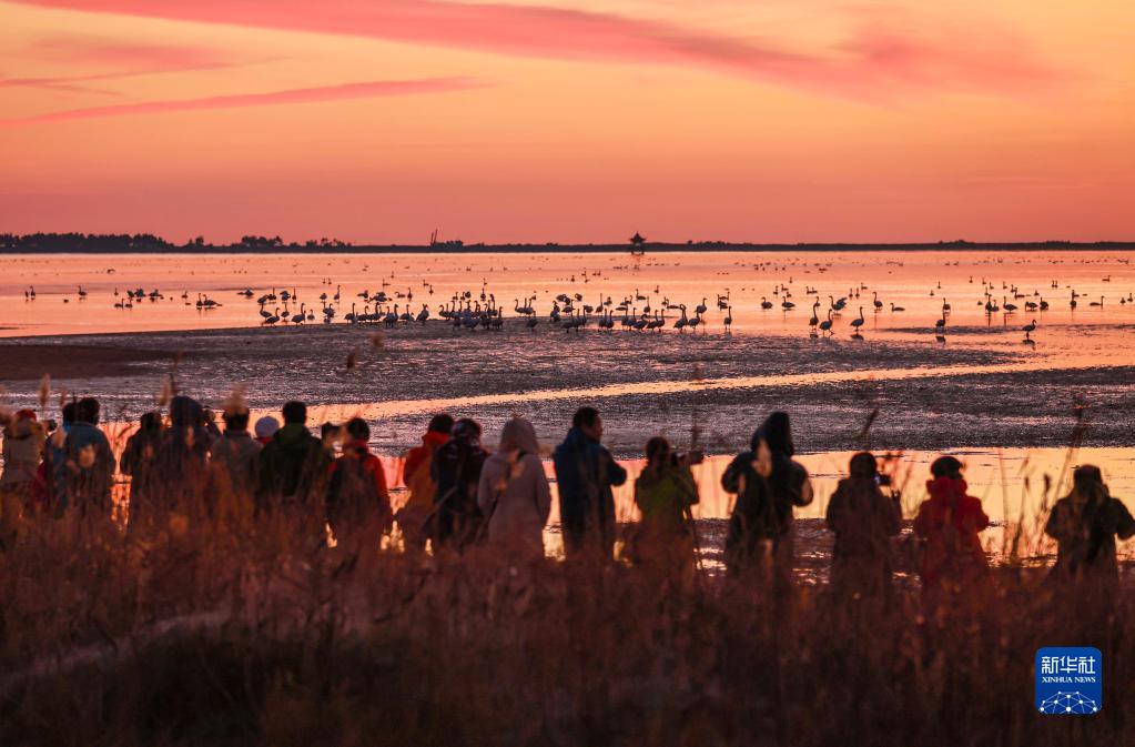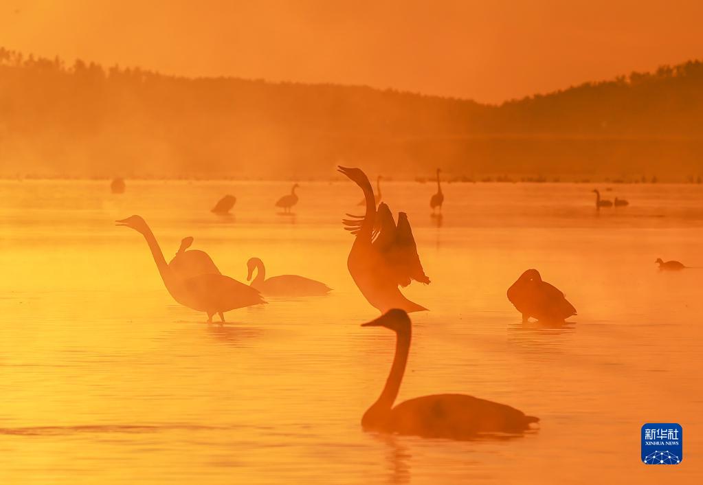 冬日清晨,山东荣成大天鹅国家级自然保护区晨雾袅袅,大天鹅在晨曦中游弋觅食、起舞飞翔,吸引众多游客前来观赏拍照。
