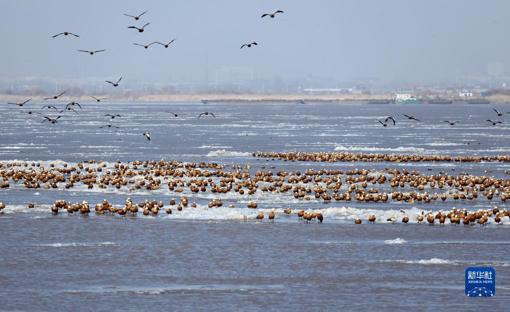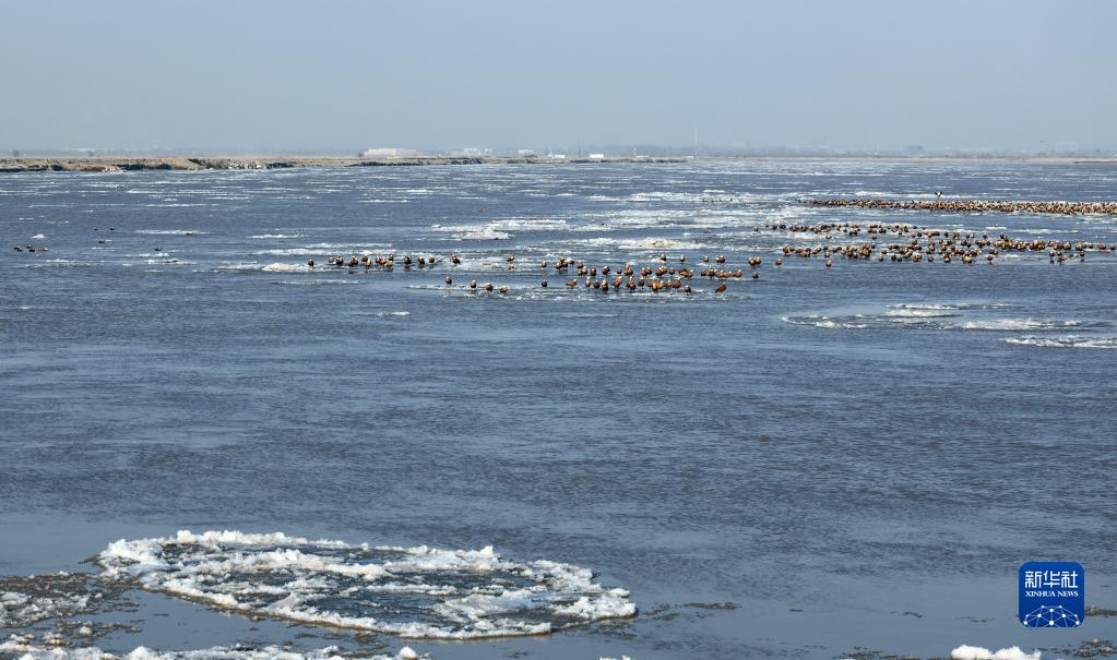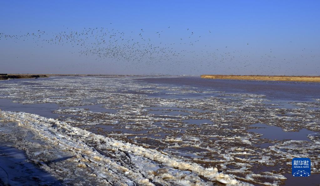 近日,受较强冷空气影响,黄河“几”字弯内蒙古段出现流凌。大批南迁的候鸟或在空中翱翔,或在刚刚封冻的冰面上栖息,场面壮观。