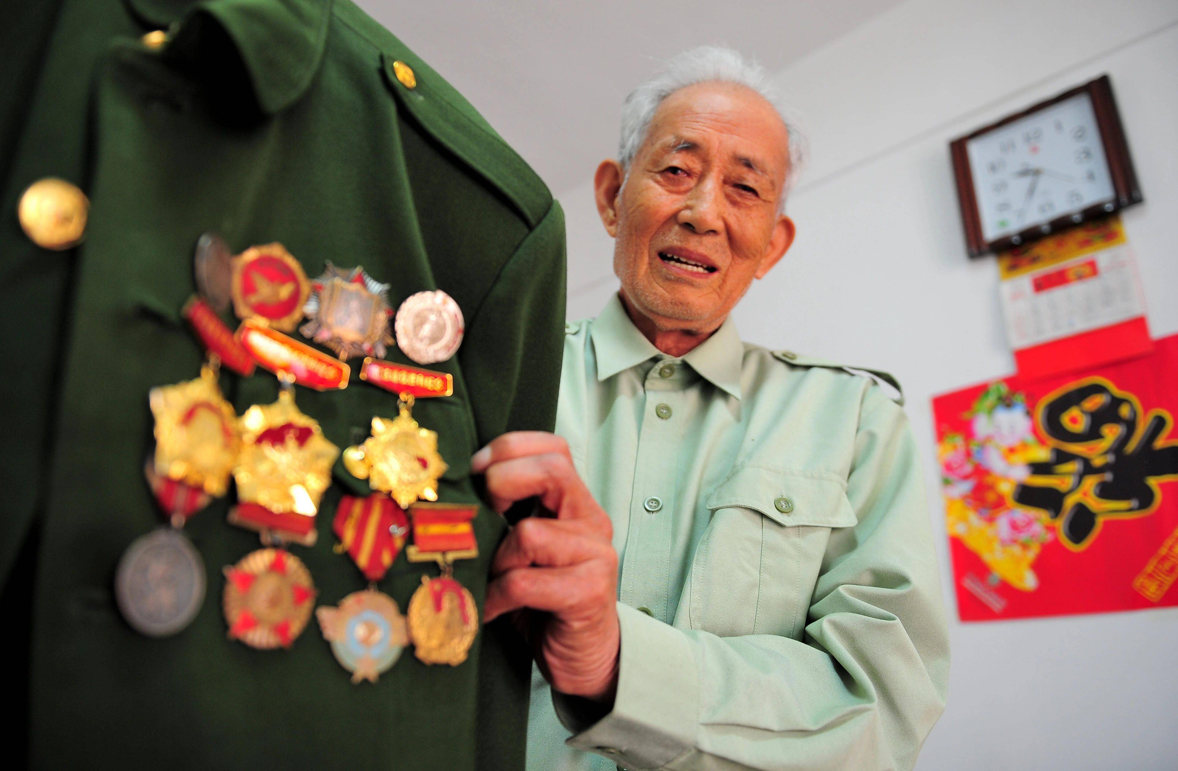 孙景坤在展示曾获得的军功章(资料图片)。刘海东摄