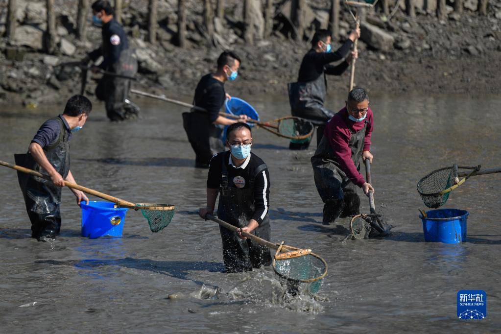 近日,2021年西溪“干塘节”在杭州西溪国家湿地公园举行。工作人员抽掉塘水清理淤泥,游客穿着下水裤体验“干塘”捕鱼。