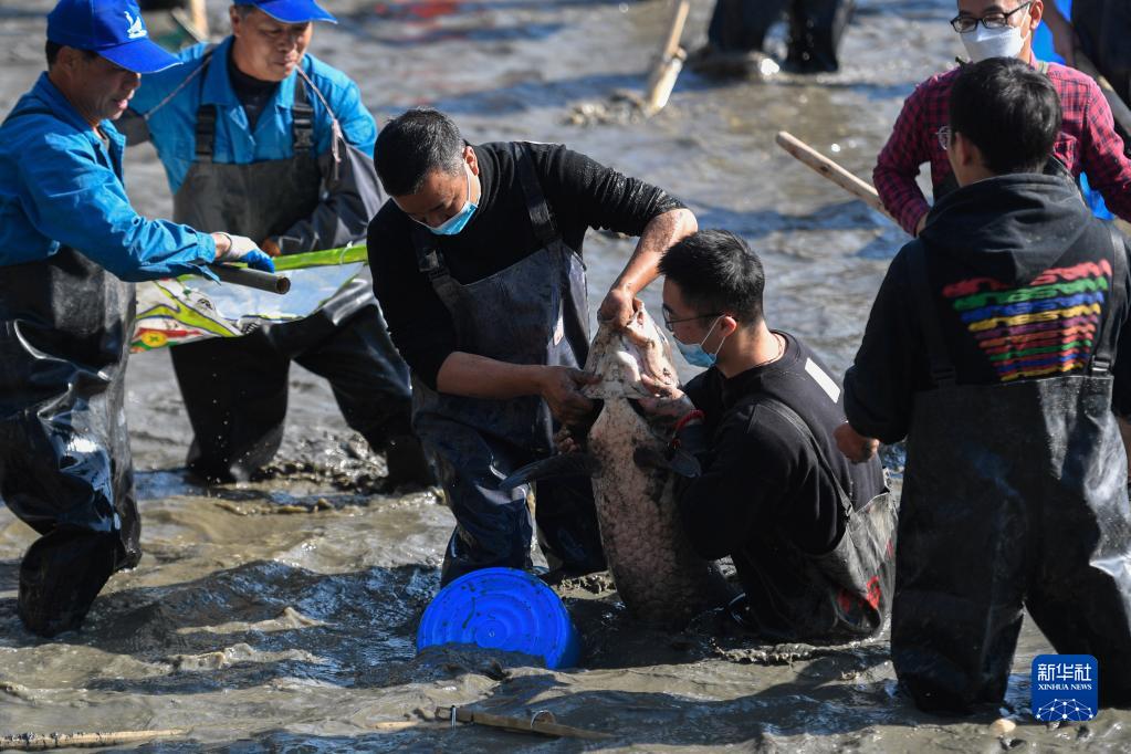 12月4日,游客在西溪湿地体验“干塘”捕鱼。