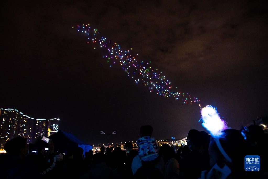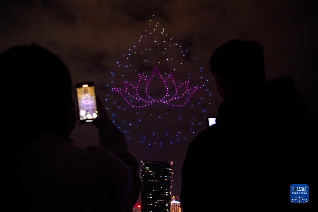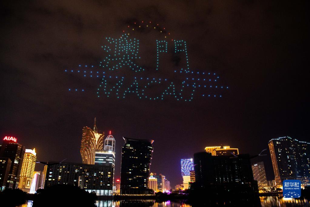 当日,由澳门特区旅游局主办的“翱游澳门无人机表演盛会”揭幕。本次“无人机表演盛会”将科技和人文艺术相融合,展示澳门的节庆气氛、安全宜游的城市风貌。新华社记者 张金加 摄