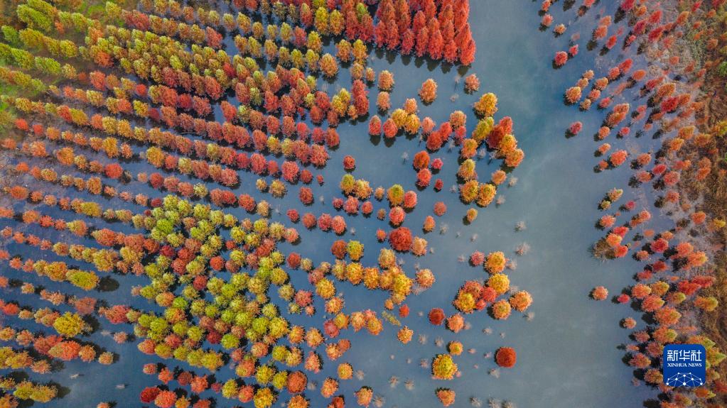 冬日,云南省昆明市盘龙区滇源街道甸尾村水杉湿地的水杉林色彩艳丽,景色如画。这片水杉湿地位于滇池上游、昆明松华坝水源保护区内。