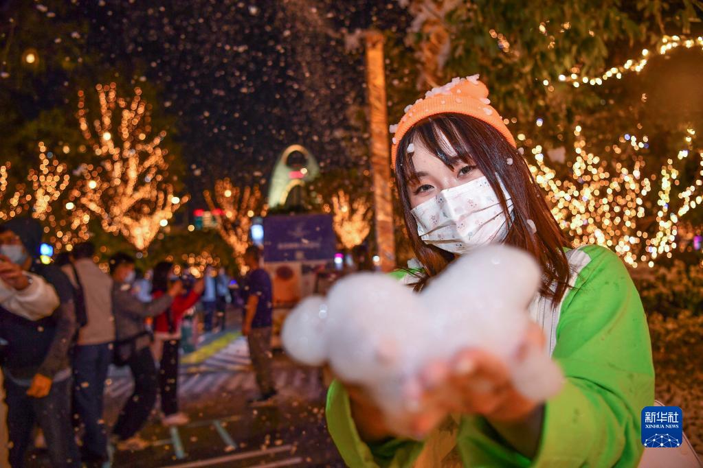 小朋友在广州夜经济集聚区天德广场感受人工降雪(12月10日摄)。