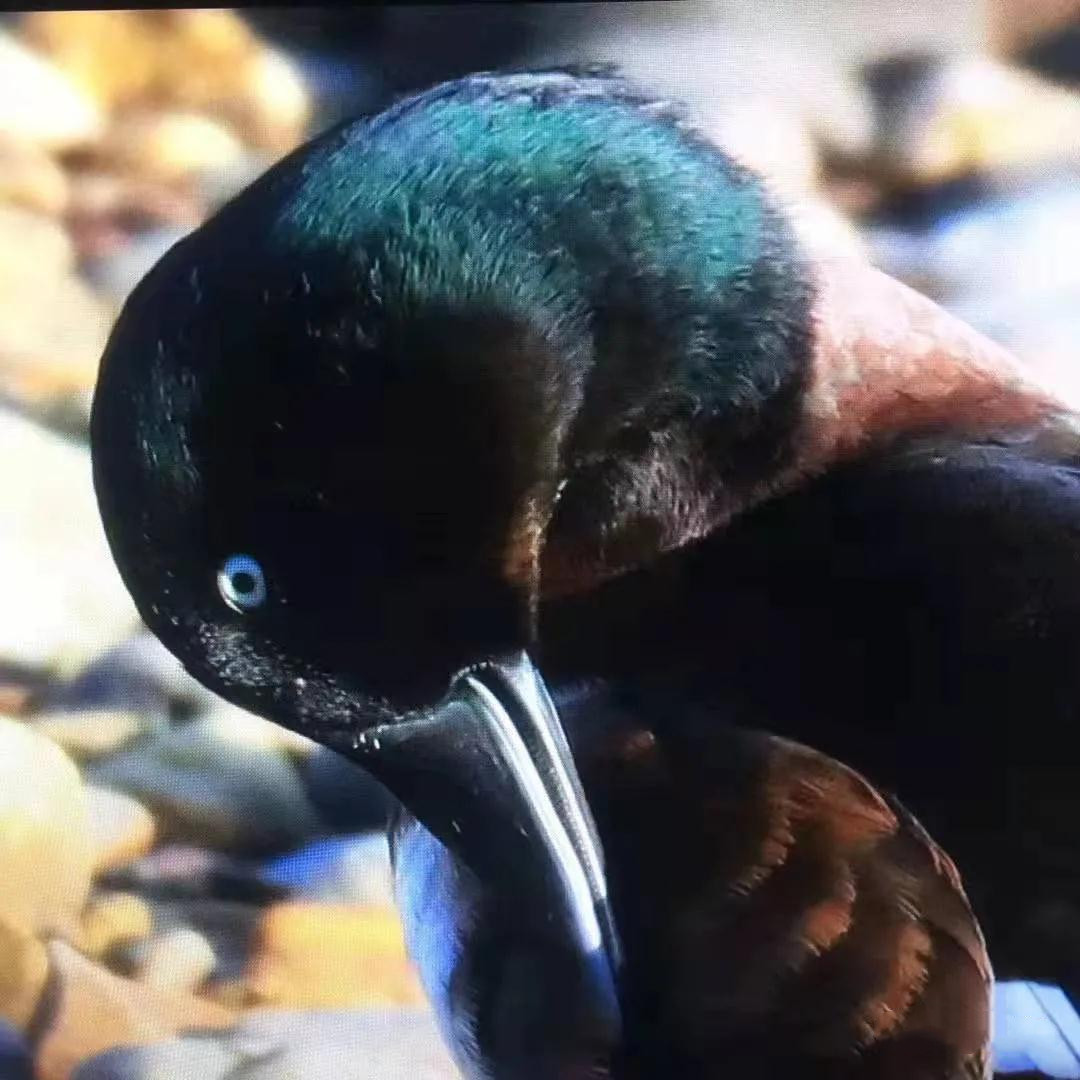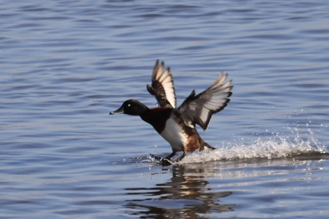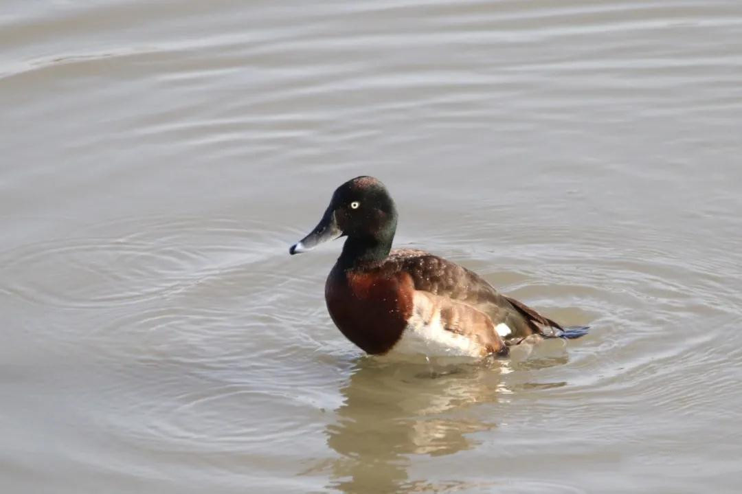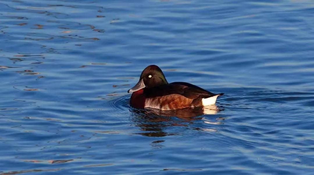 青头潜鸭是雁形目鸭科潜鸭属的鸟类,体圆,头大。雄鸟头和颈黑色,并具绿色光泽,眼白色;上体黑褐色,下背和两肩杂以褐色虫蠹状斑;腹部白色,与胸部栗色截然分开,并向上扩展到两胁前面,下腹杂有褐斑;两肋淡栗褐色,具白色端斑。雌鸟体羽纯褐色。