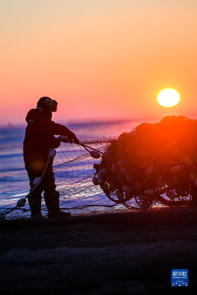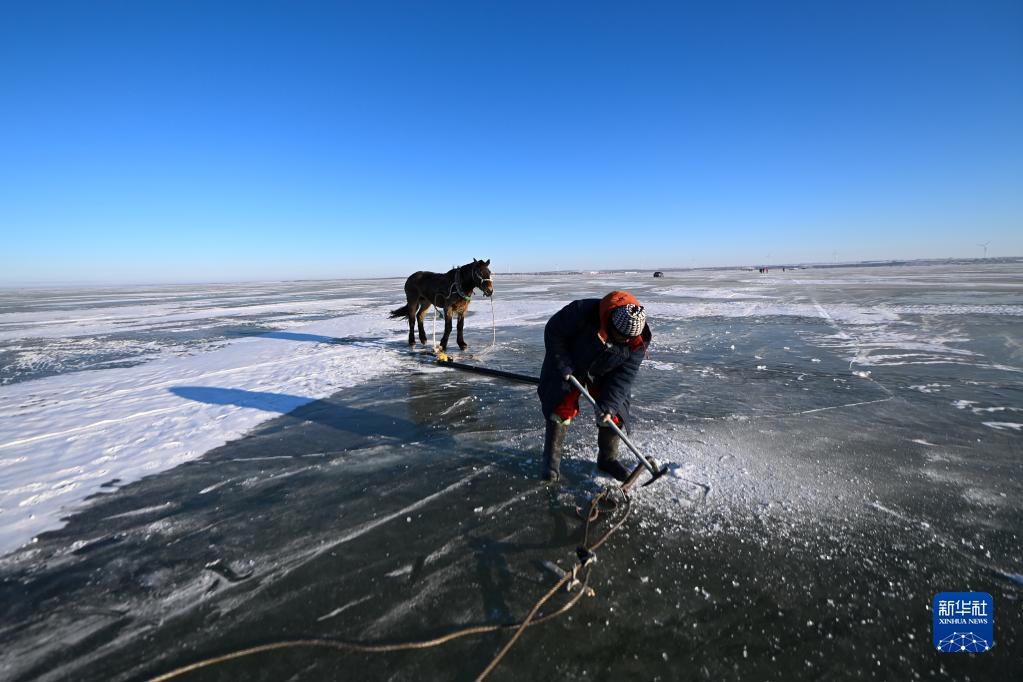 12月26日,渔民赶马拉动绞盘,使渔网在冰面下按照既定位置放置(无人机照片)。