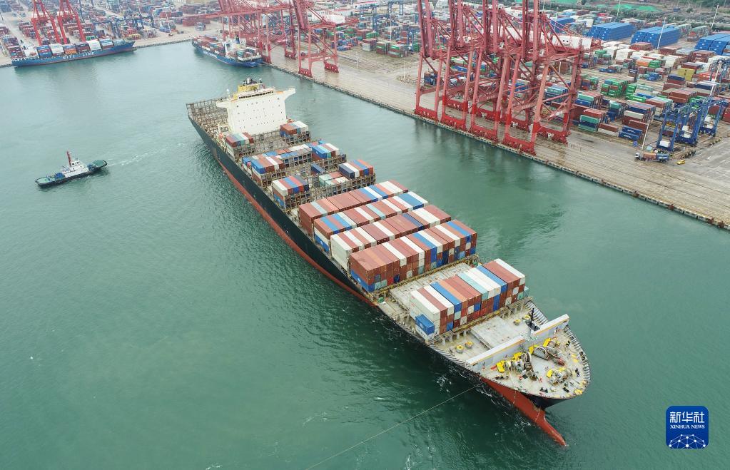 远洋巨轮频繁进出,集装箱不断被起吊、装运,船来船往,繁荣忙碌,畅通有序。