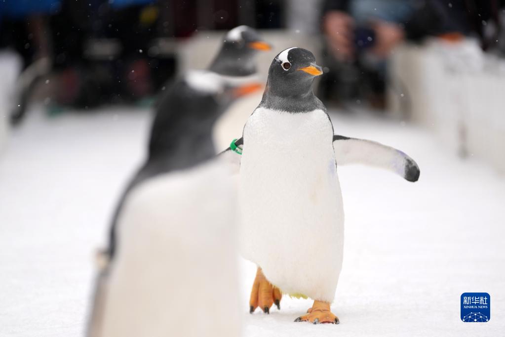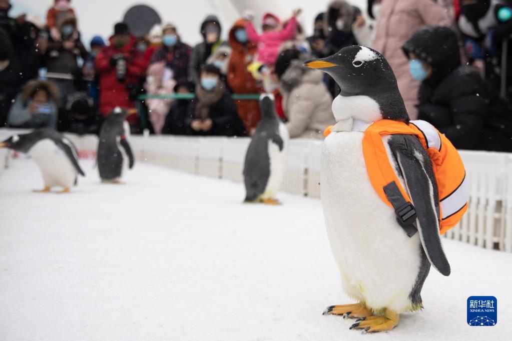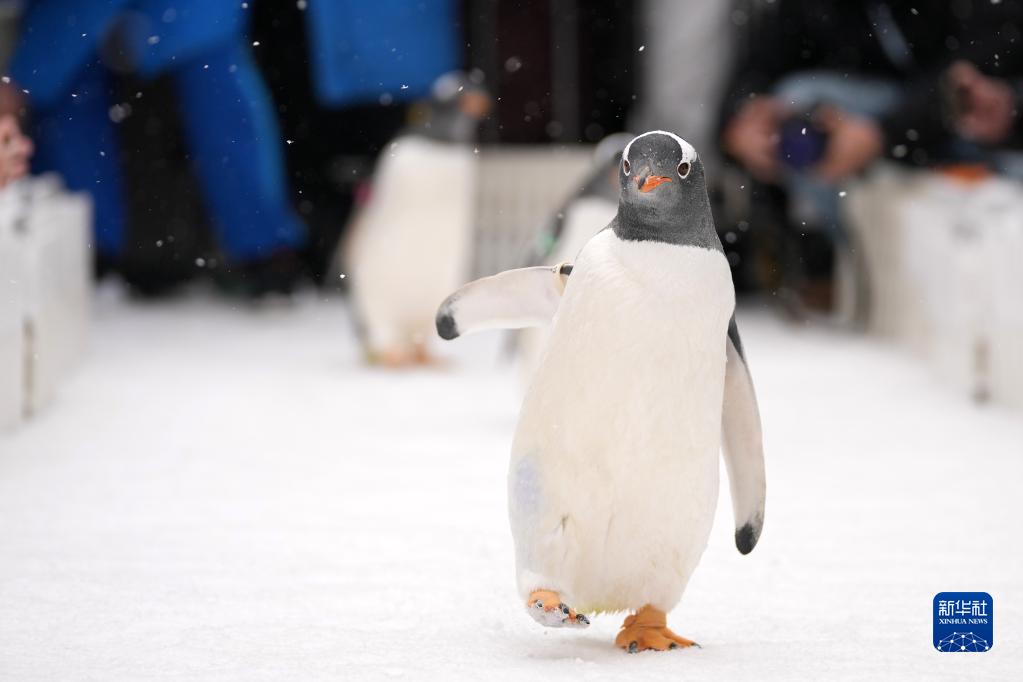 1月15日,哈尔滨极地公园的企鹅在户外“溜达”。