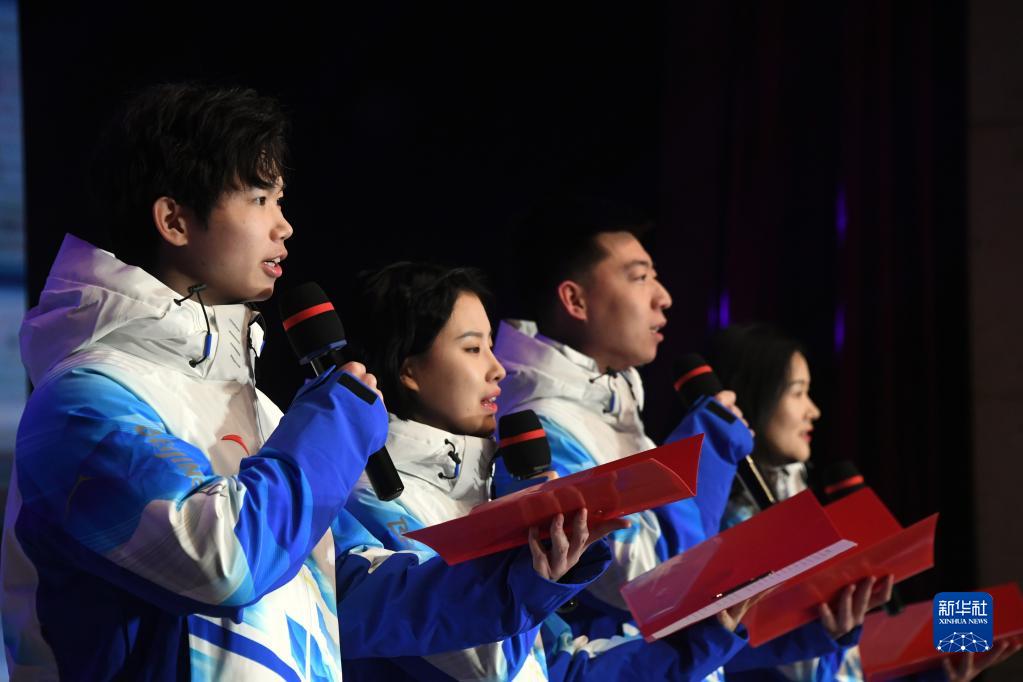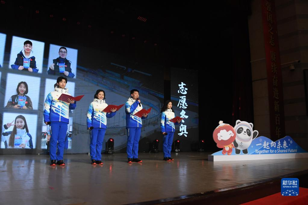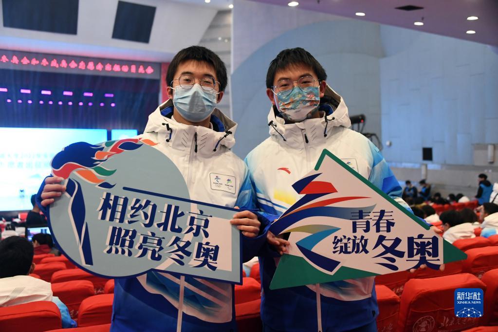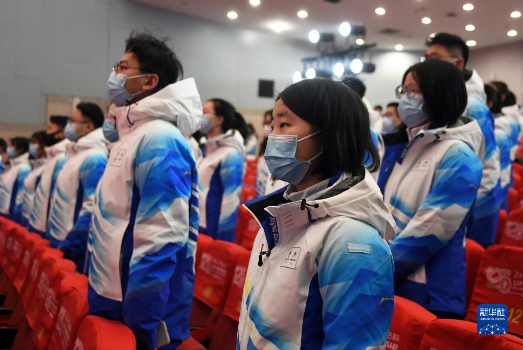 1月18日,志愿者在北京交通大学2022年冬奥会和冬残奥会志愿者出征动员大会上宣誓。