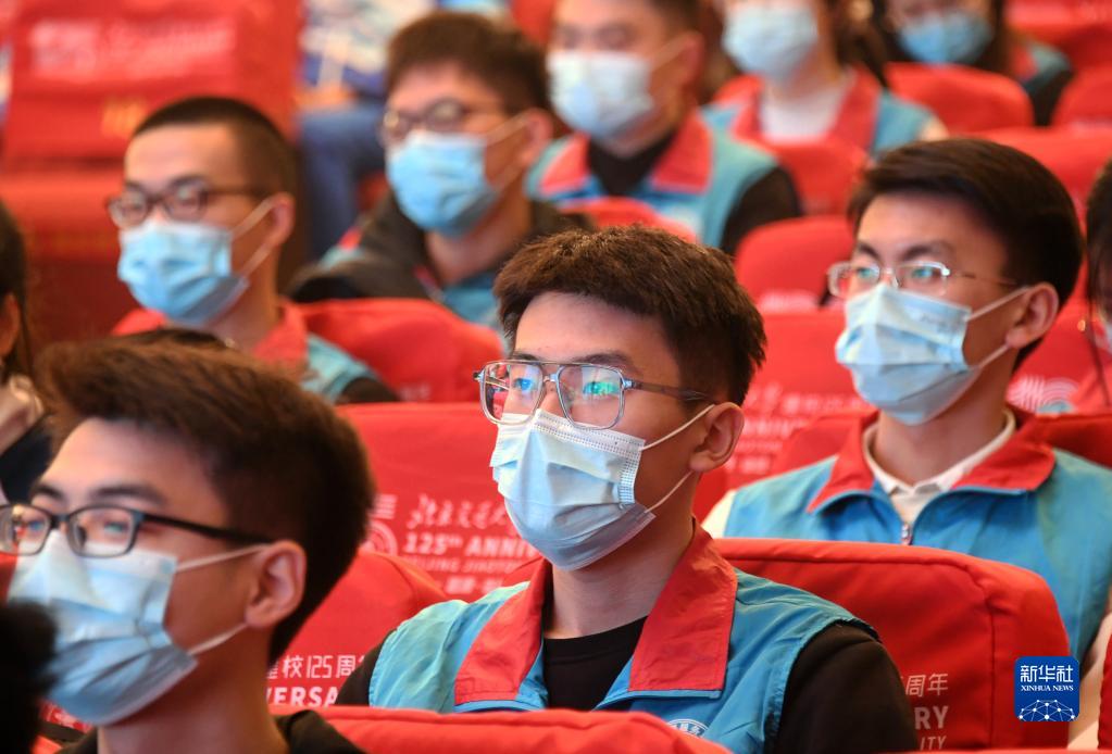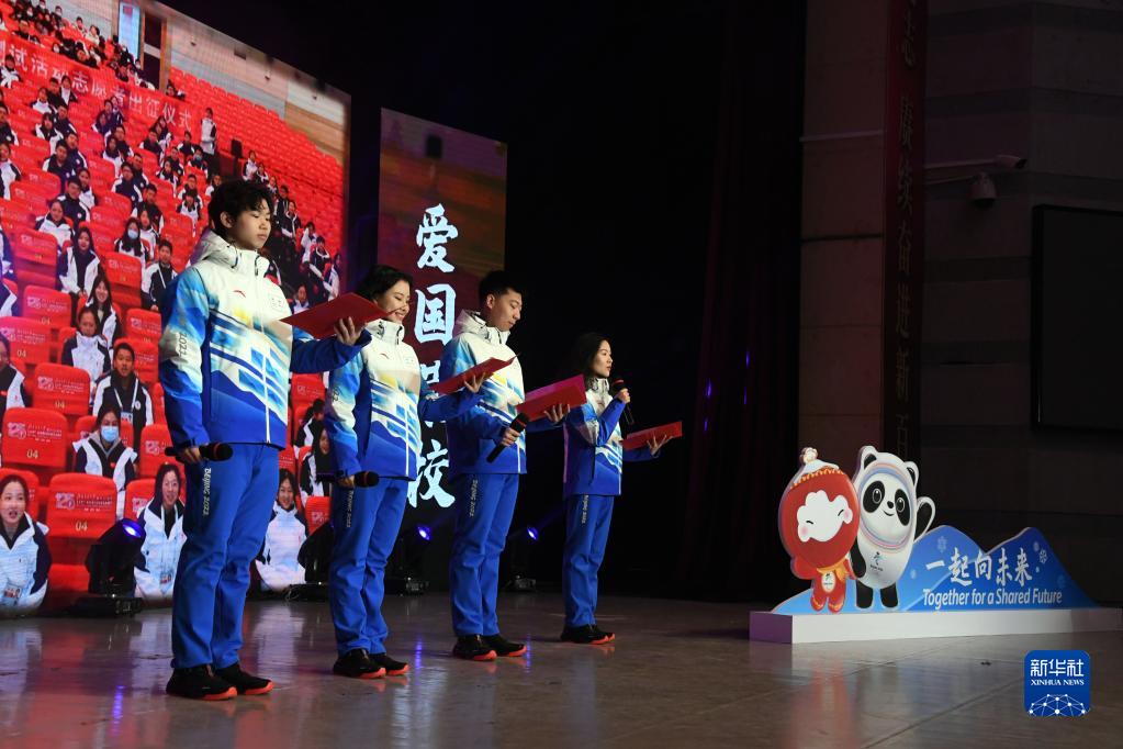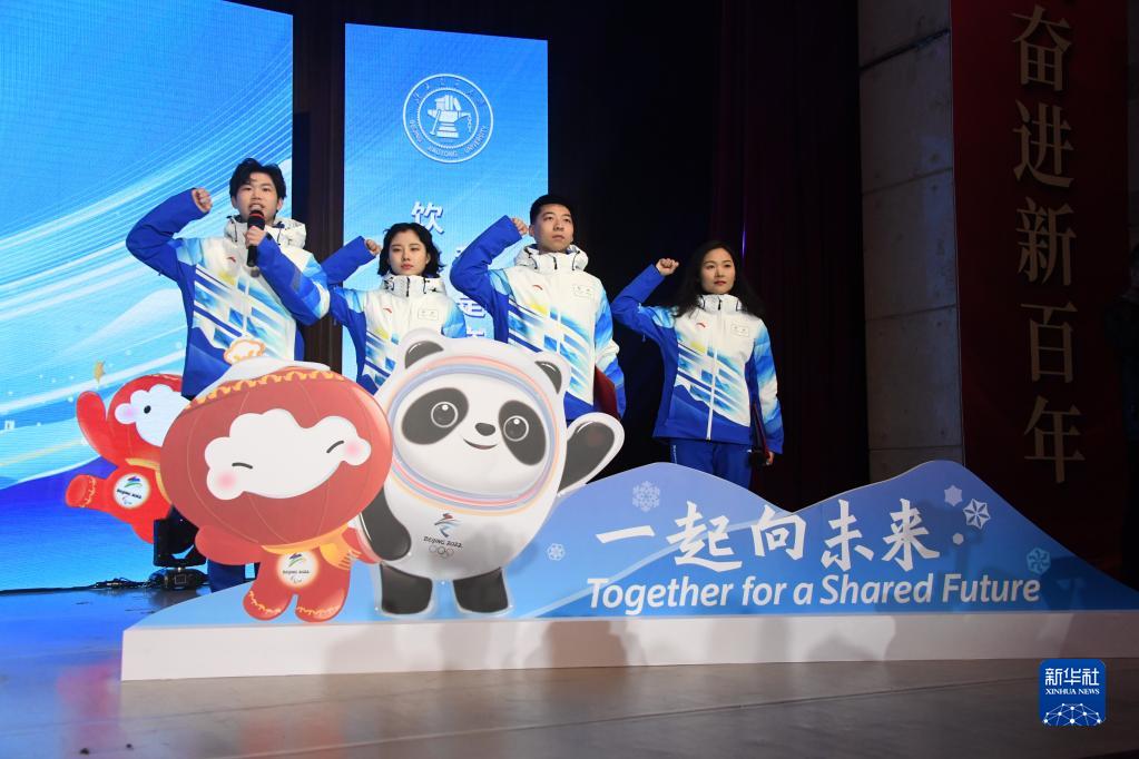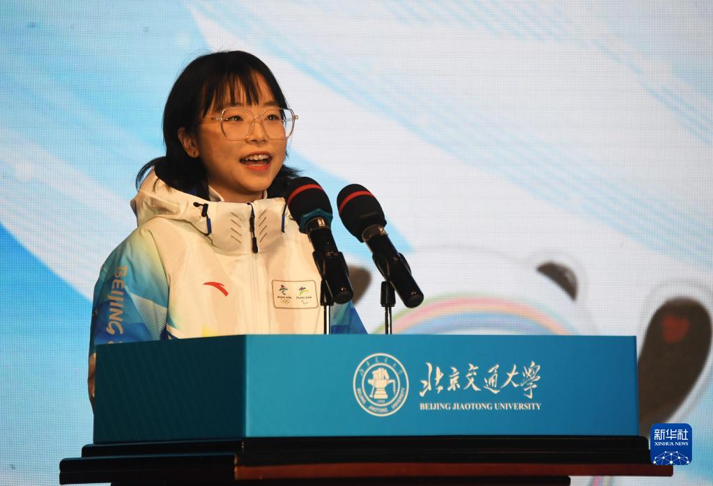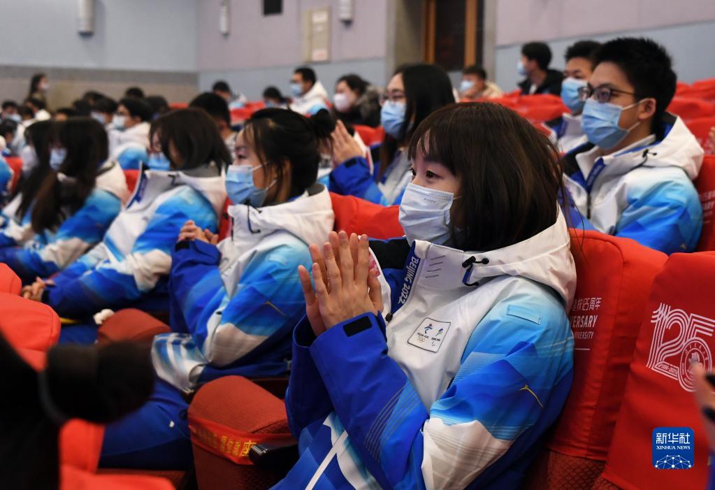 1月18日,志愿者在北京交通大学2022年冬奥会和冬残奥会志愿者出征动员大会上宣誓。