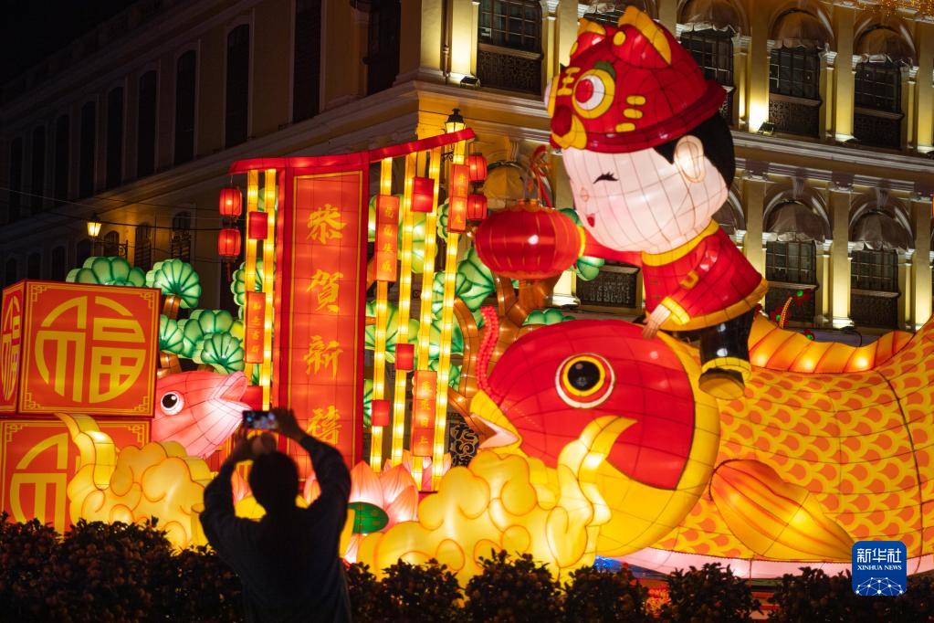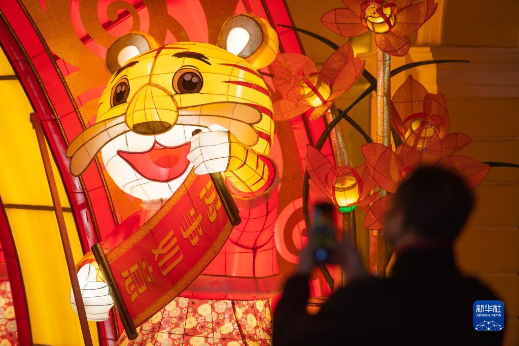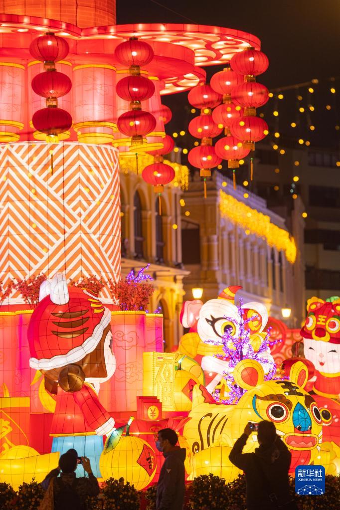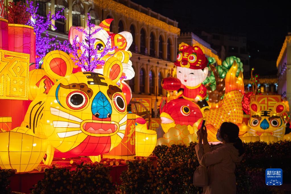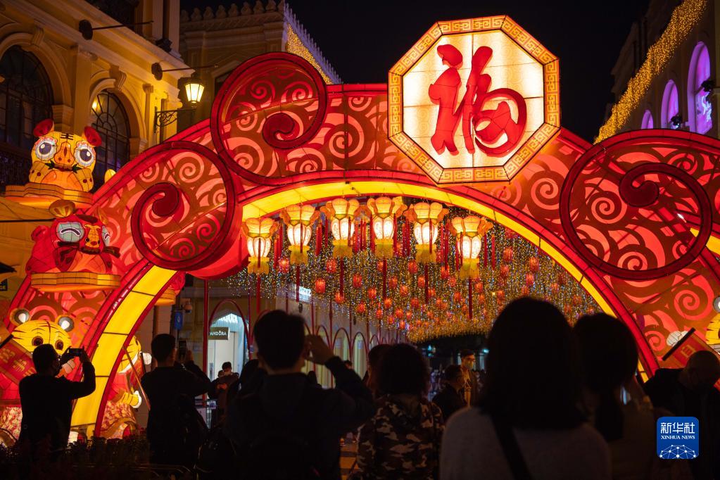 春节临近,澳门特区市政署以“虎虎生威迎新春”为主题,在澳门各区布置贺年灯饰。灯饰已全面点亮,吸引市民前来感受过年的气氛。