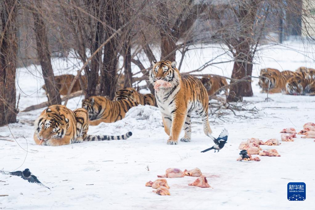 1月25日,黑龙江东北虎林园的东北虎在进食。