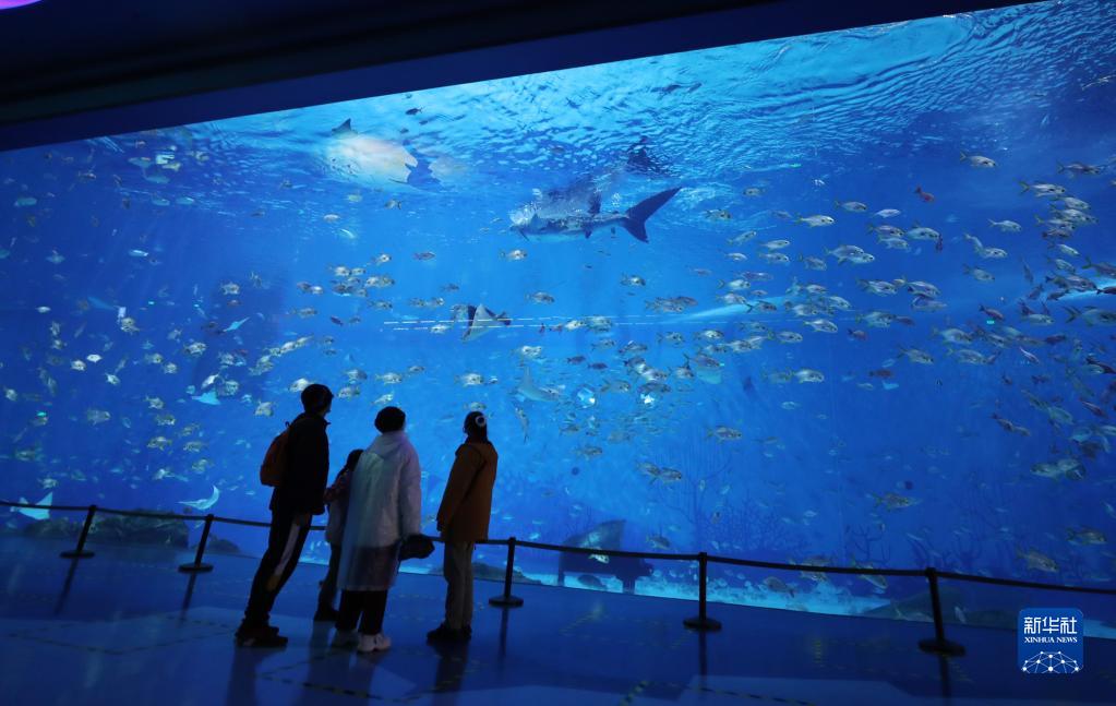 1月26日,小朋友在上海海昌海洋公园观看仿生鲸鲨。